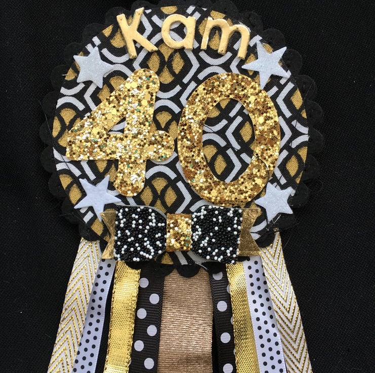 Birthday badges made in felt/fabric, this is a lovely glam 40th Black and gold design