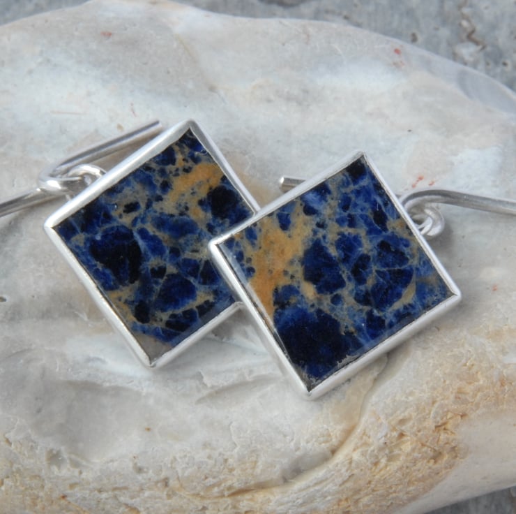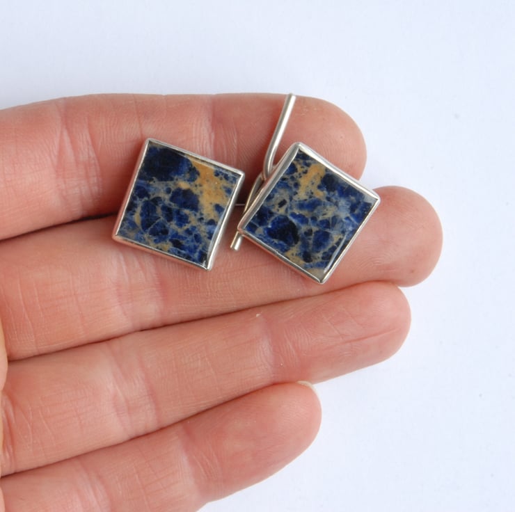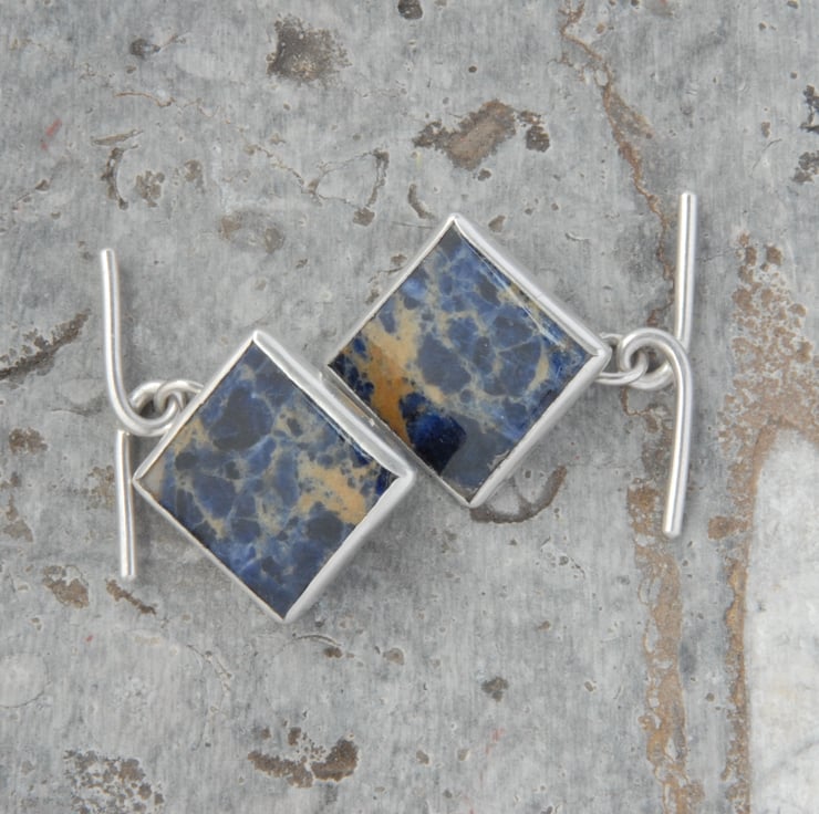 These sterling silver cufflinks feature bezel set dark blue sodalites and traditional chain and bar backs. The sodalites are square but I have mounted the back so that they should sit more diamond like in the cuff. They are a dark navy blue with mid blue and beige veining and I think would compliment any suit.