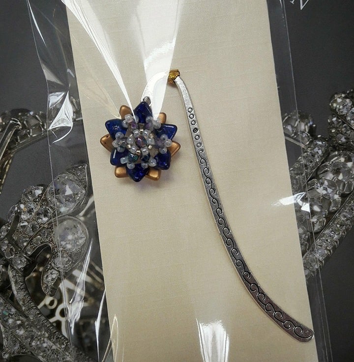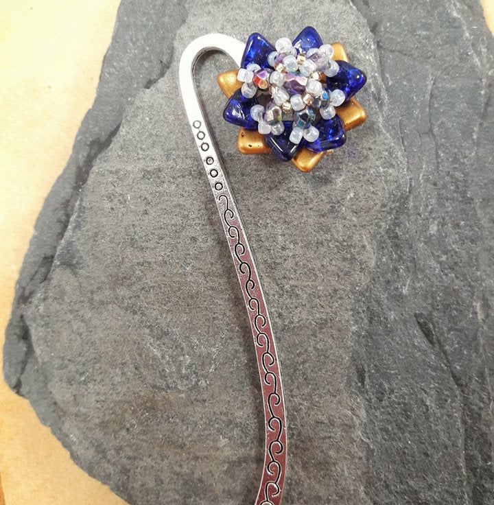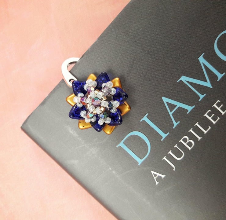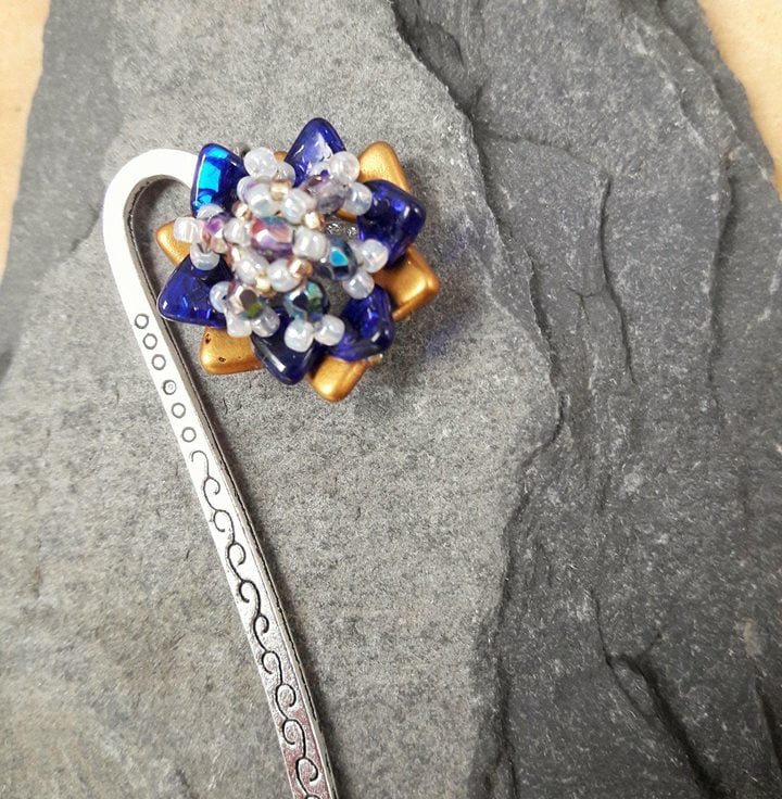 Hand stitched with specialist needle and thread to make this pretty little flower bookmark. The beads are very unique in a triangular shape, creating beautiful petals in cobalt blue and deep gold. Combined with seed beads and Czech ab blue iridescent crystals.