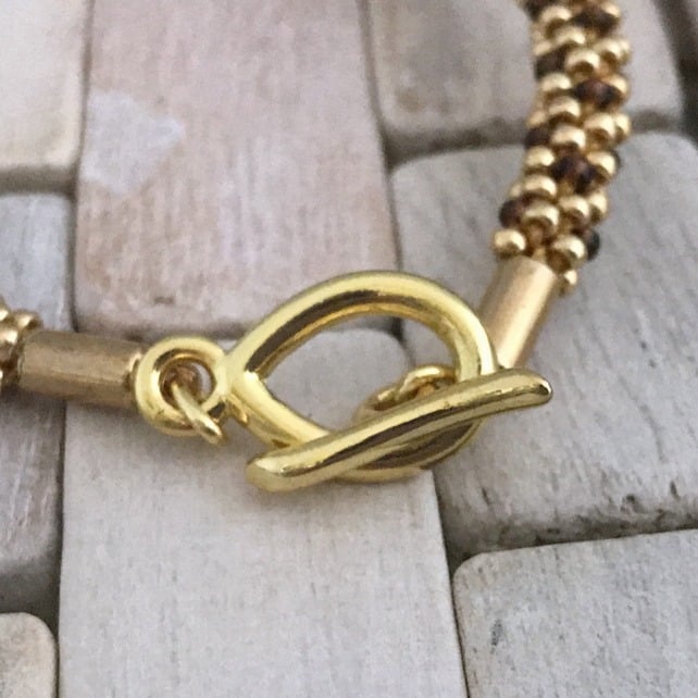 To complete the look, I have made a beaded kumihimo chain using the same colour seed beads, where I have threaded the beads on to 8 strands of S-Lon cord and then brought them together using the above technique. The necklace chain fastens with a gold plated teardrop shaped toggle clasp.