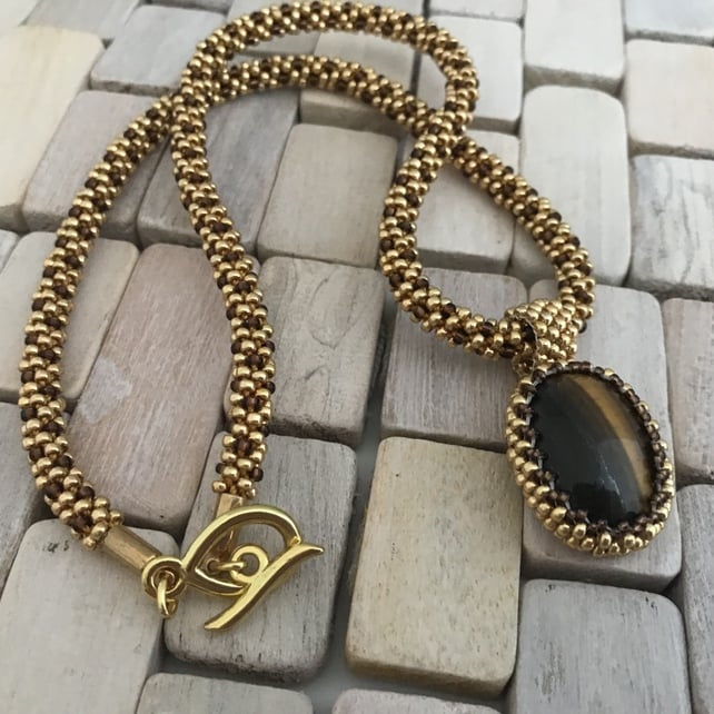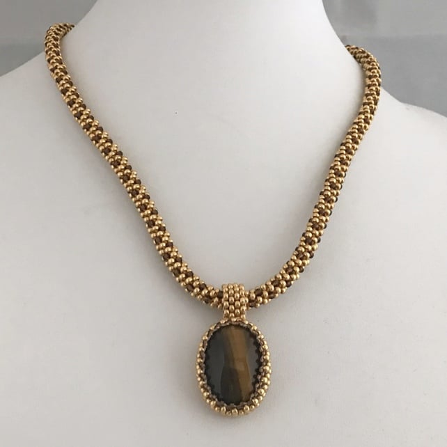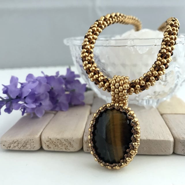 The main feature of this necklace is a Tiger's Eye cabochon that I have encased in Miyuki seed beads using the bead weaving technique peyote. The colours I have used are gold and silver lined chocolate that compliments the golden brown tones in the Tiger's eye.