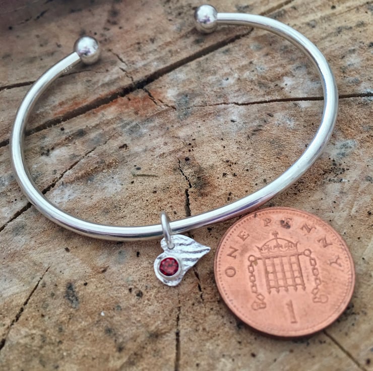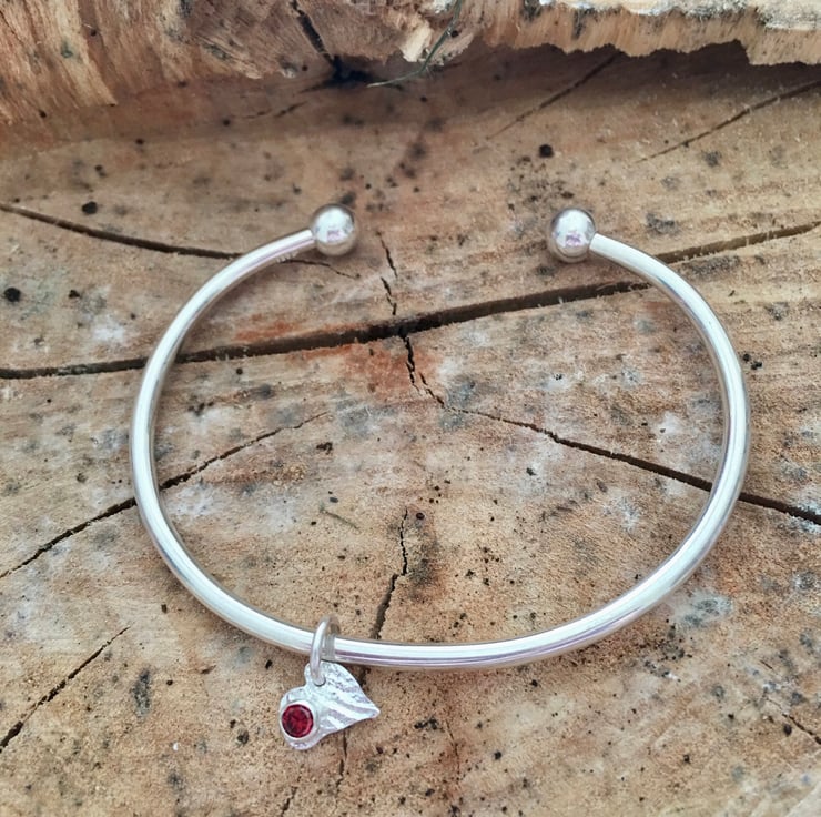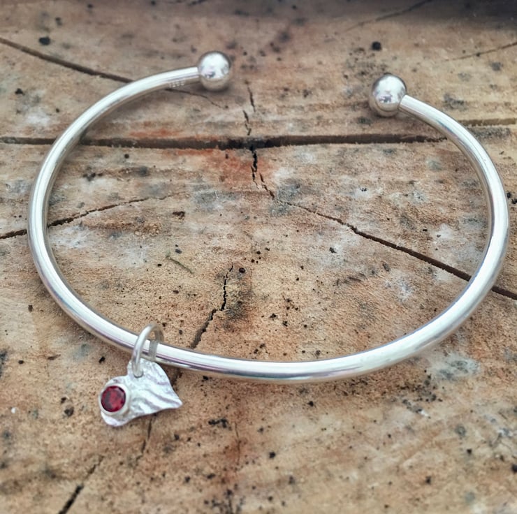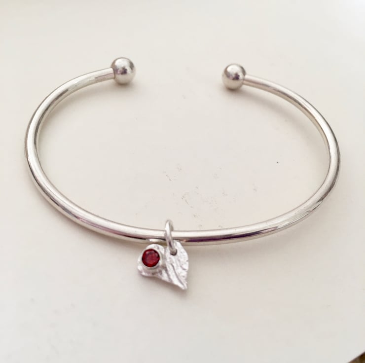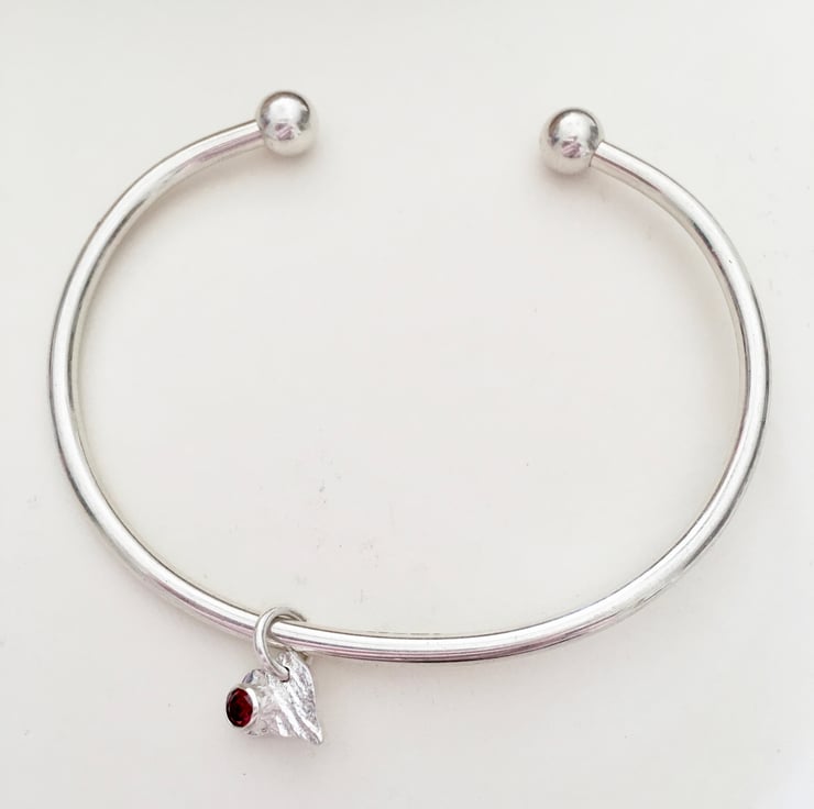 A heavy solid silver bangle - plain &simple with a red cubic zirconia set in a reticulated silver heart.