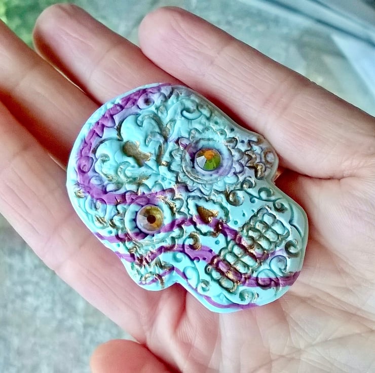 This fridge magnet has been made with marbled polymer clay in light blue and purple. It has been formed in a sugar skull shaped mould and the decorative indentations have been highlighted with gold paint. The eyes have been inset with sparkling Swarovski crystals.