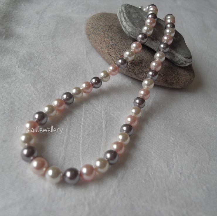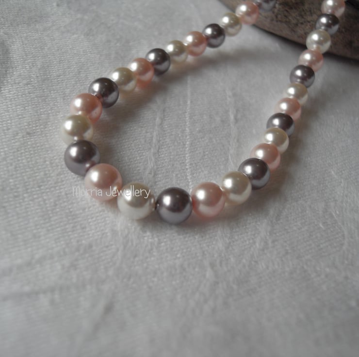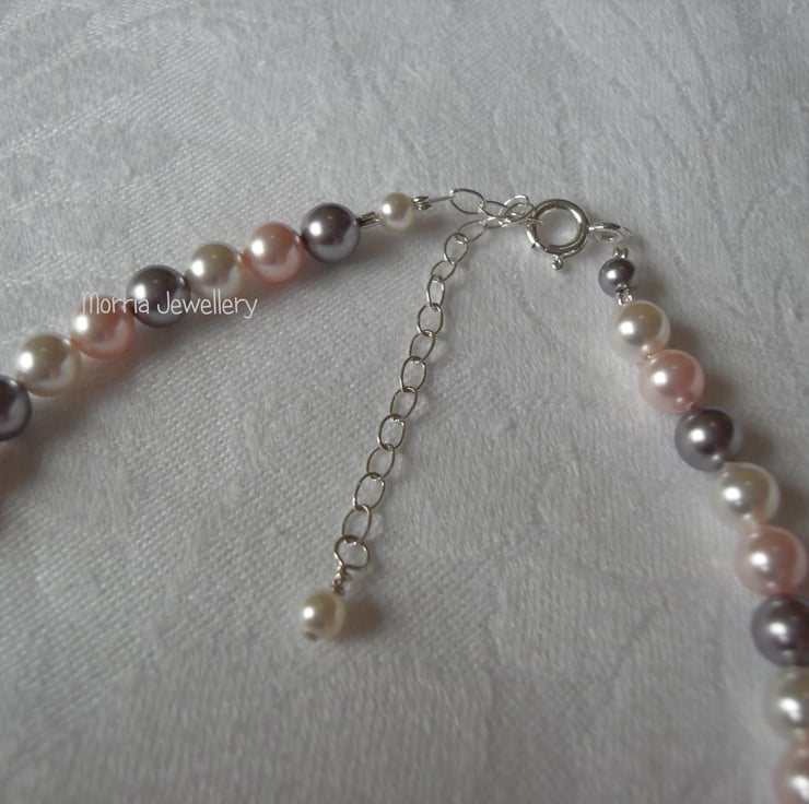 Made to order. Part of the WPM (White,Pink, Mauve) Collection. A classic pearl necklace made with 6mm high end crystal pearls in white, pink and mauve. The necklace has a sterling silver extender chain.