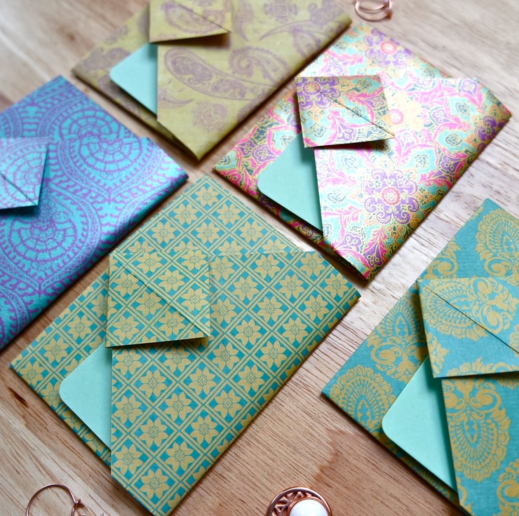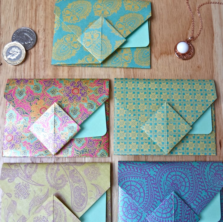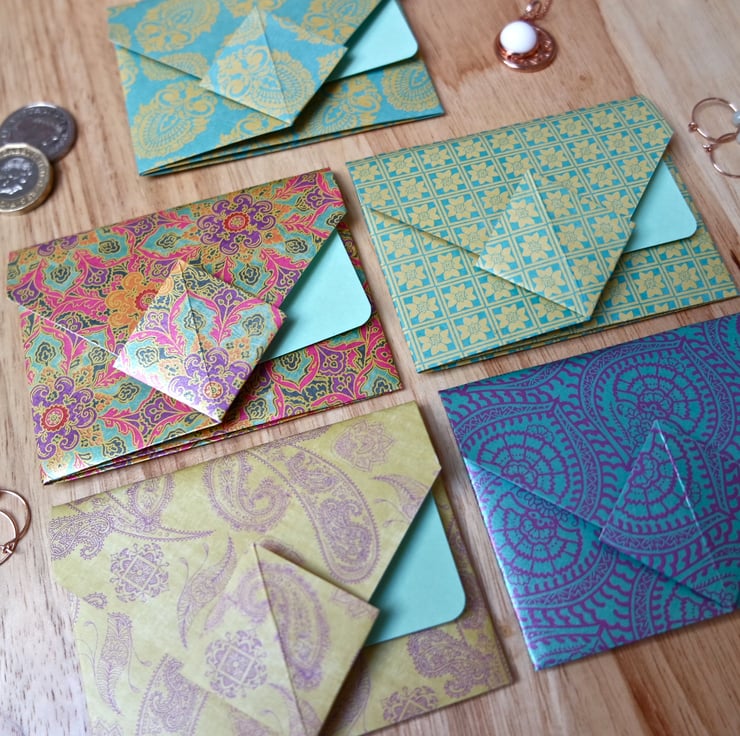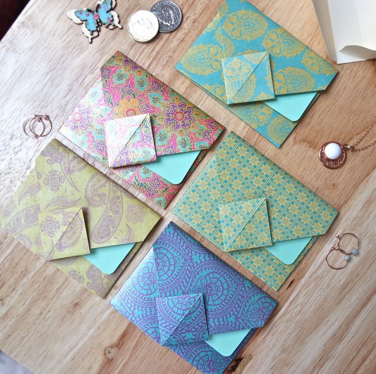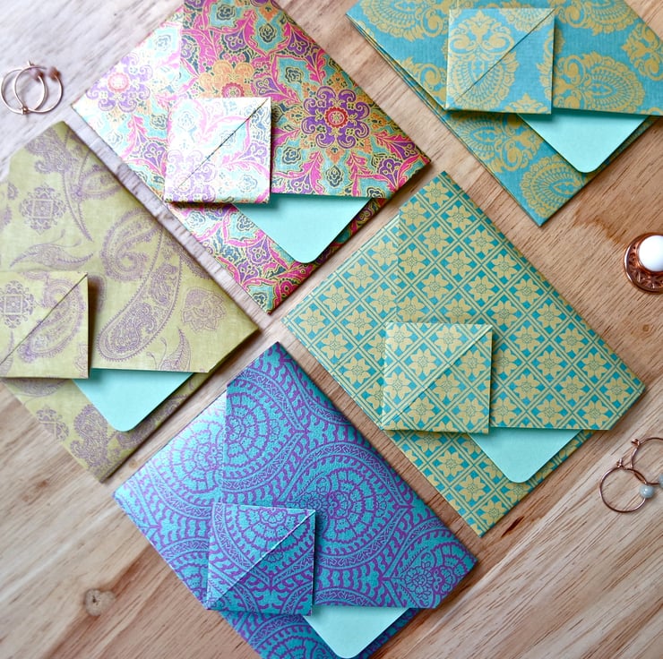 This is a beautiful set of 5 origami envelopes in vibrant colours, mandala style flowers, paisley and geometric patterns with matching/contrasting mint-green mini cards.