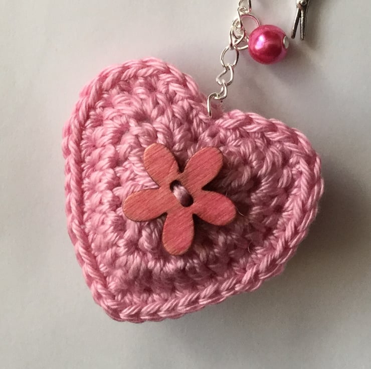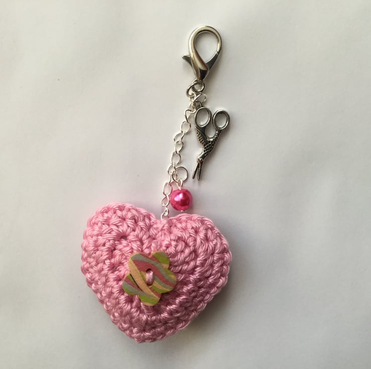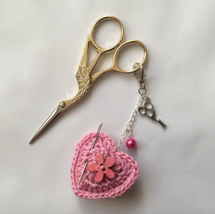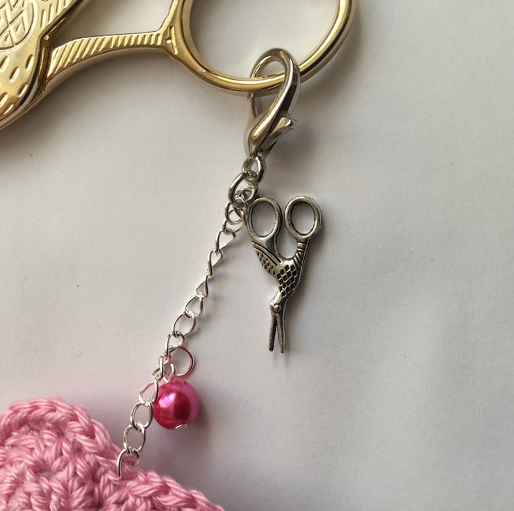 The heart is hanging from a piece of chain with a lobster claw catch for attaching to your embroidery scissors, together with a bright pink glass pearl bead and a white metal scissors charm.