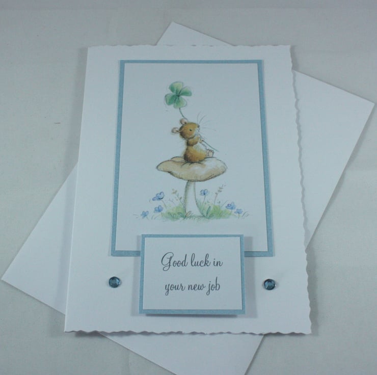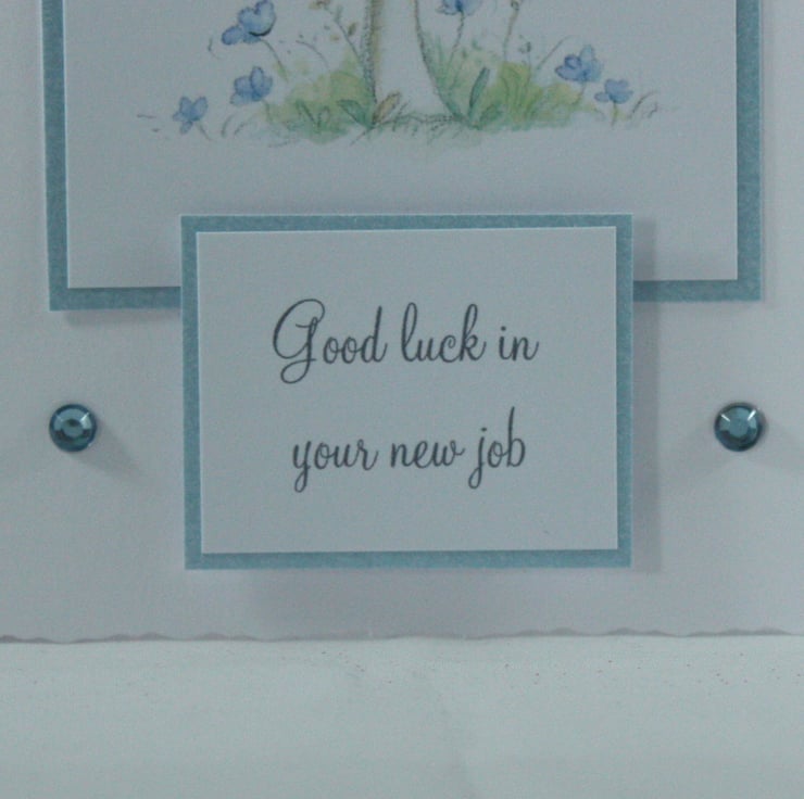 The image has been framed with pale blue card along with a message reading 'Good luck in your new job'. The card is finished with two small blue gems.