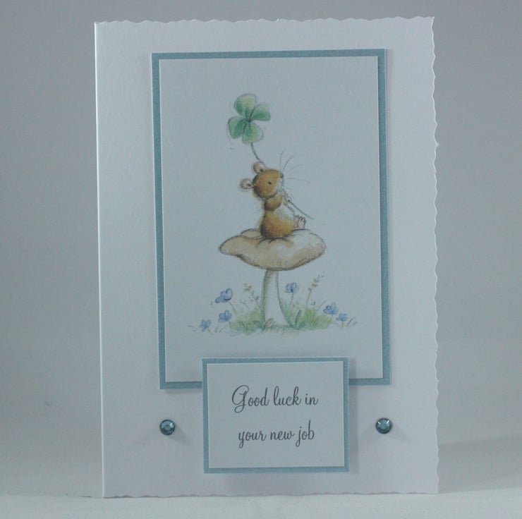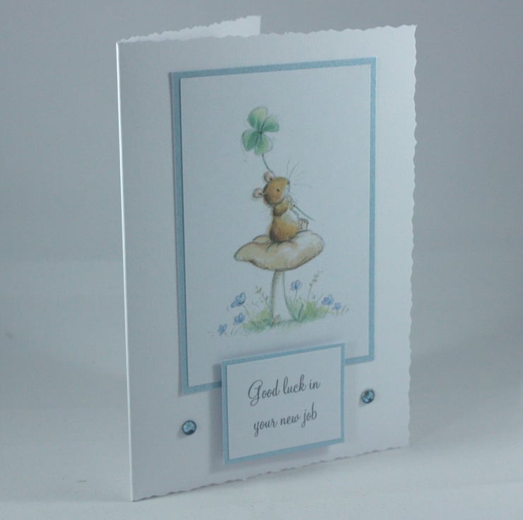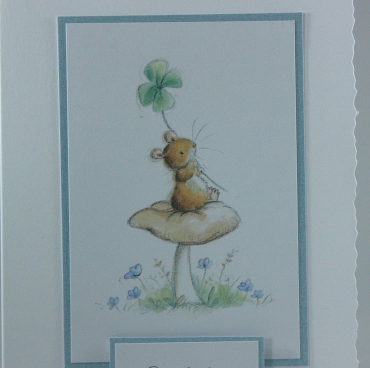 The card features a cute image of a mouse with a four leaf clover sitting on a toadstool.