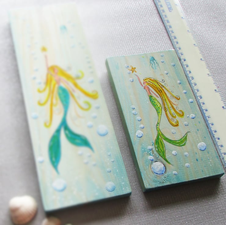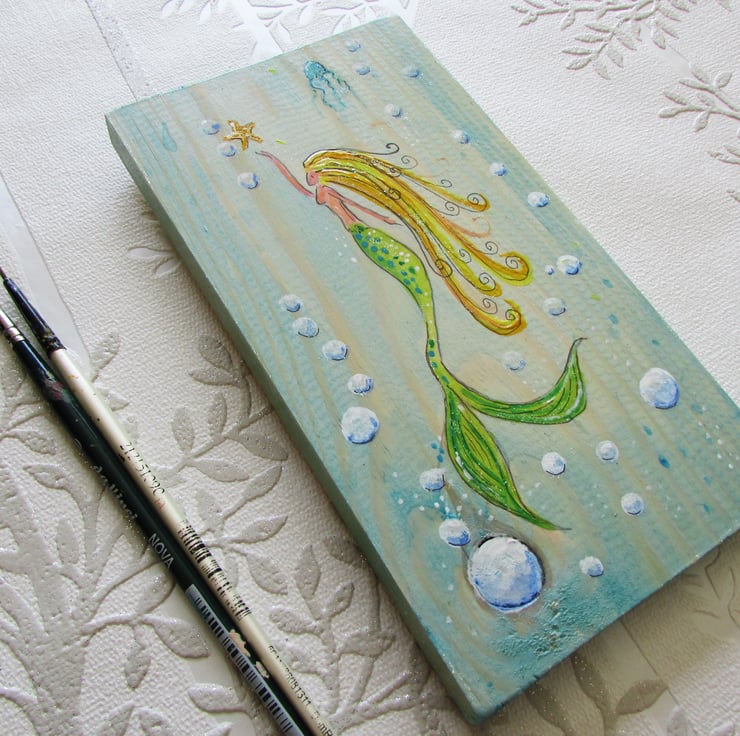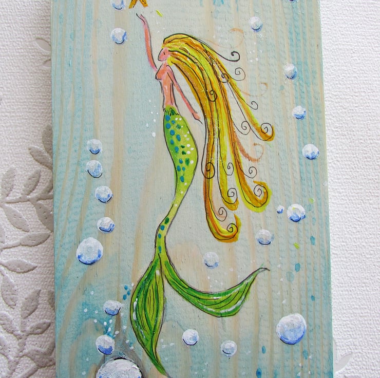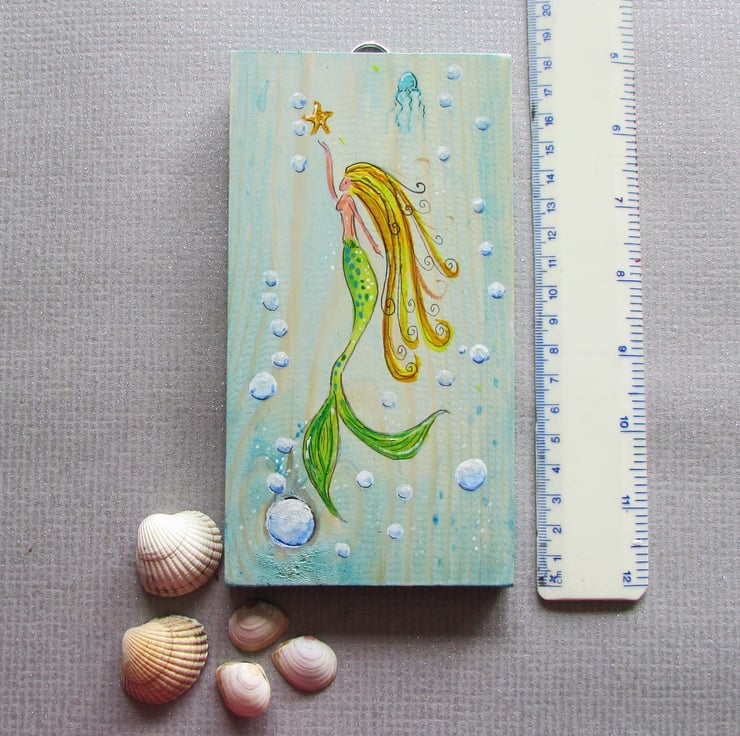 Mermaid with green tail and golden hair swimming in the sea with a jellyfish a starfish and surrounded by bubbles. Painted on wood with acrylic paints and finished off with varnish and a bit of shimmer. It has a 'D' ring for hanging.