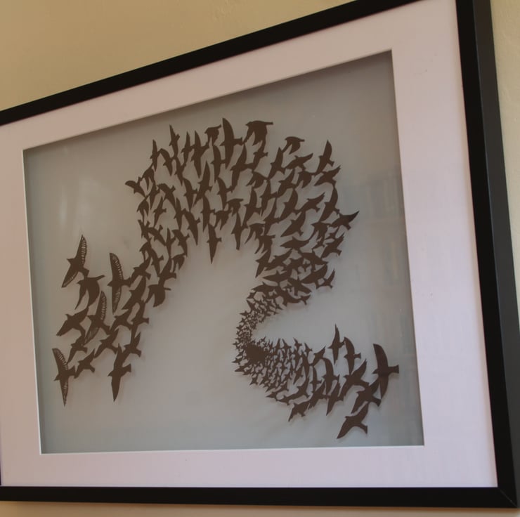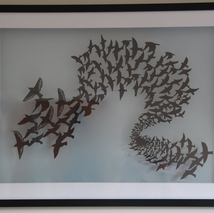 After seeing the marvellous spectacle of a starling murmuration I decided to try to capture the pure magnificence of the movement. I felt a good way of doing this was to create a paper cut which mounted will cast a shadow to almost create the sensation of more birds in behind, adding movement and depth.