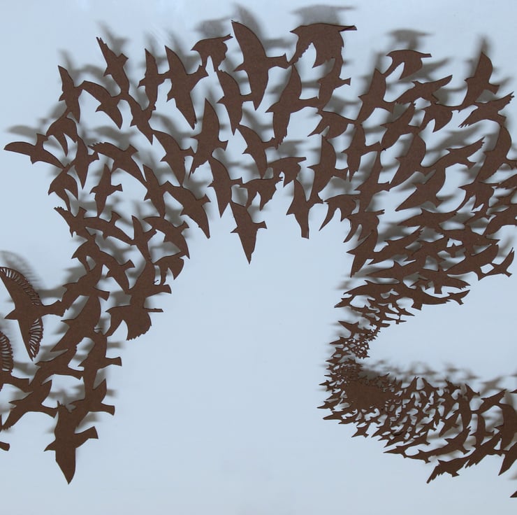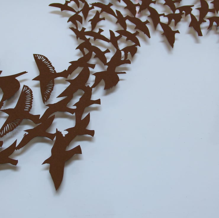 'Murmuration' is a paper cut carefully cut from one dark brown piece of paper.