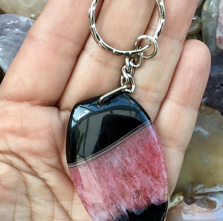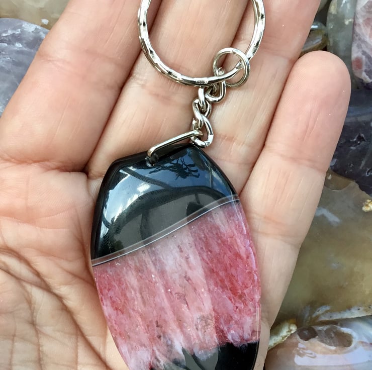 The gemstone itself, when held straight, measures approx 52mms in length, approx 35mms in width, with a depth of approx 6mms, at its widest points. The complete length of the keyring is approx 10.6cms.