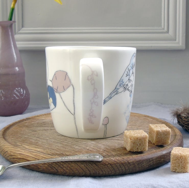 A pretty yet practical mug. My illustrations of seed heads and chaffinches have been professionally printed onto ceramic transfers which are cut and applied by hand to create the finished design. The design reaches around the outside of the mug with detail on the handle and interior.
