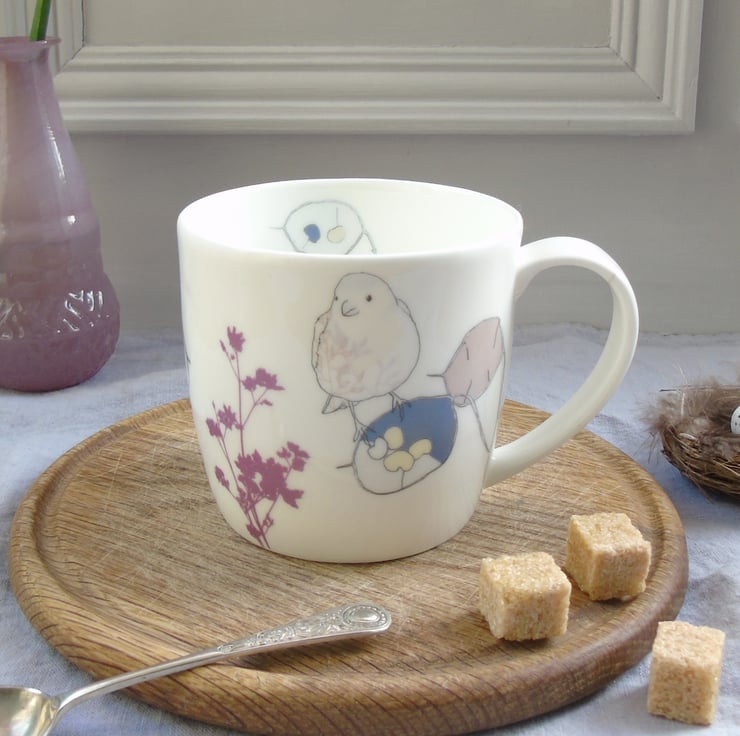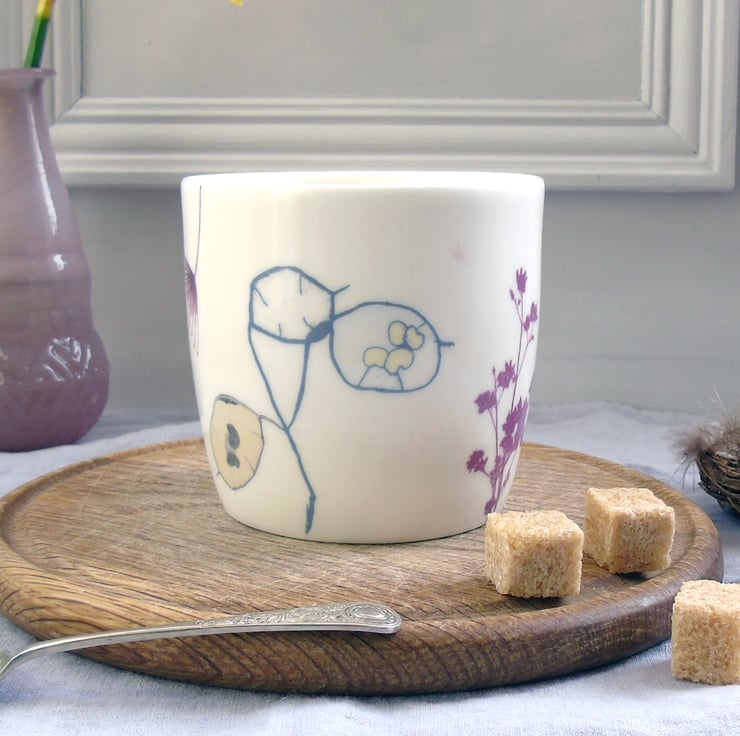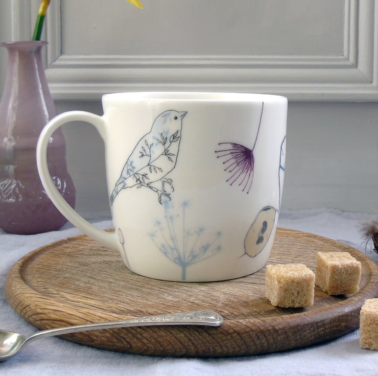 Hand decorated, bone china mug with honesty seedheads and chaffinch design.