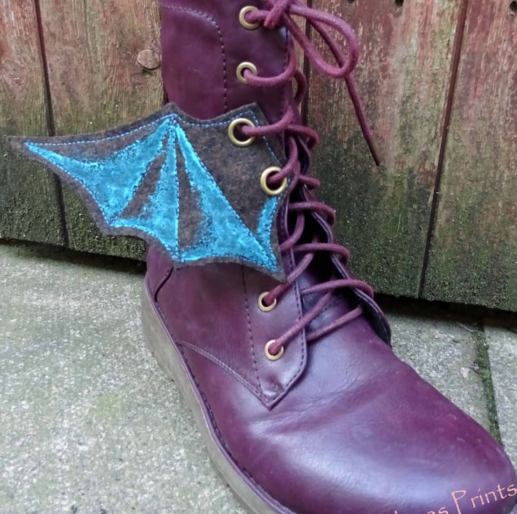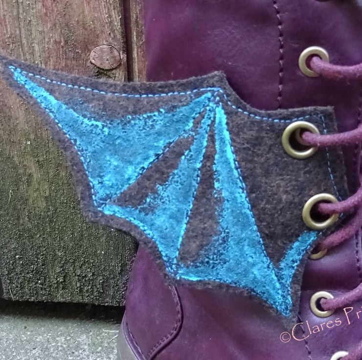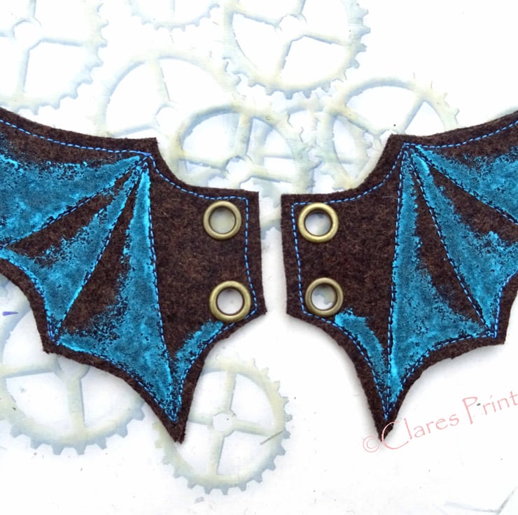 Made from 100% wool felt with two antique brass eyelets on each wing so can be threaded onto boots, corsets etc.