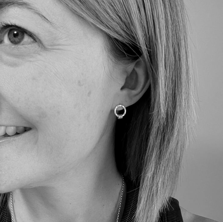 These delicate circle stud earrings are crafted from recycled sterling silver with a hammered finish that catches the light. Small 9ct gold-filled rings add warmth and contrast, creating a simple yet eye-catching everyday pair.