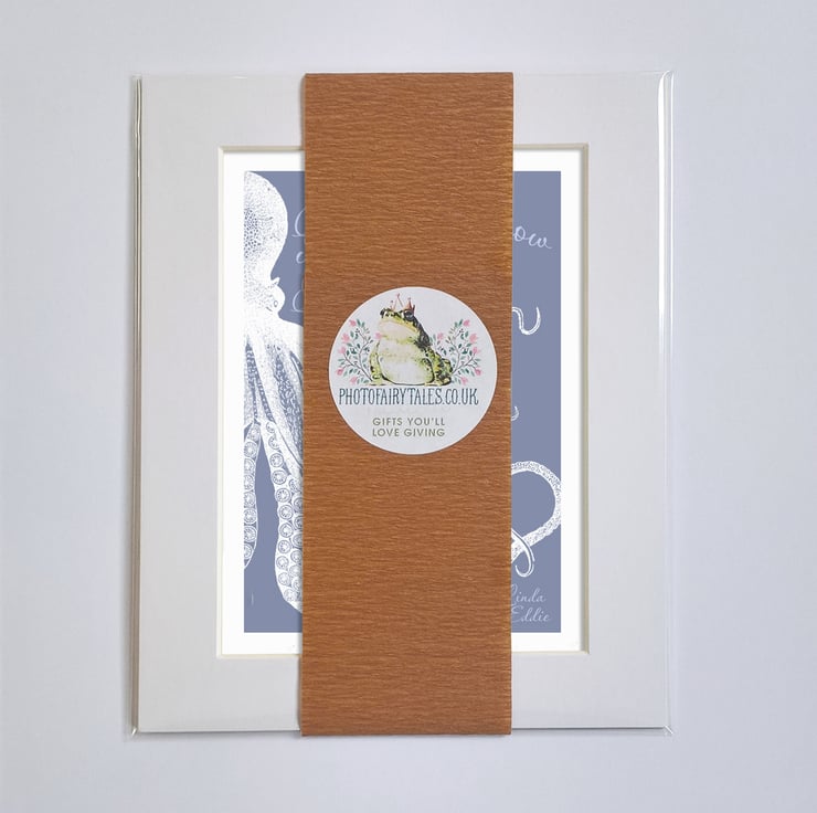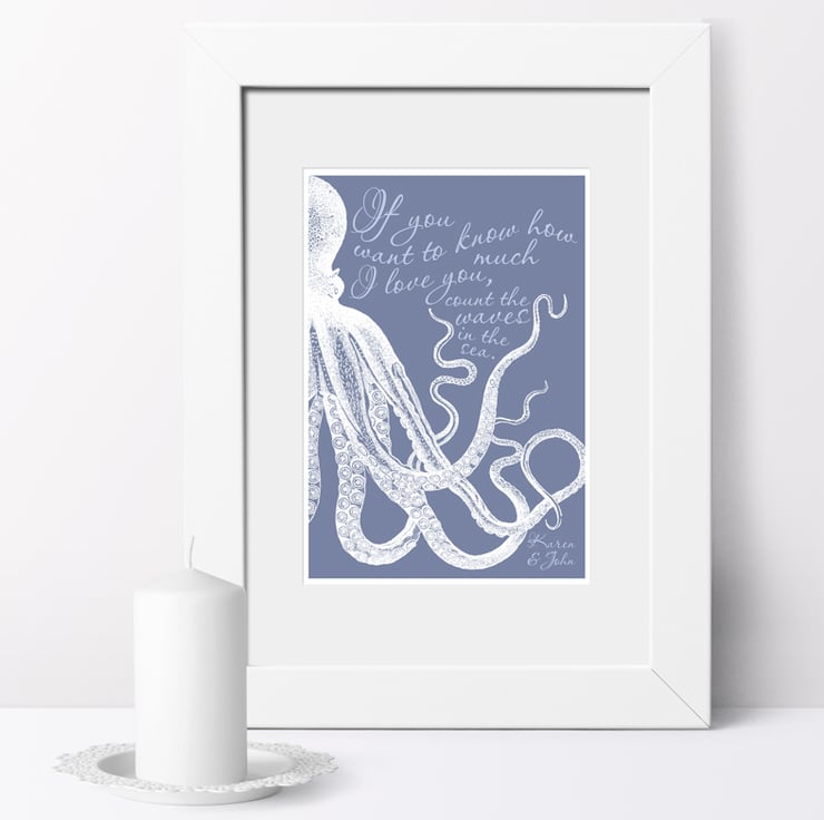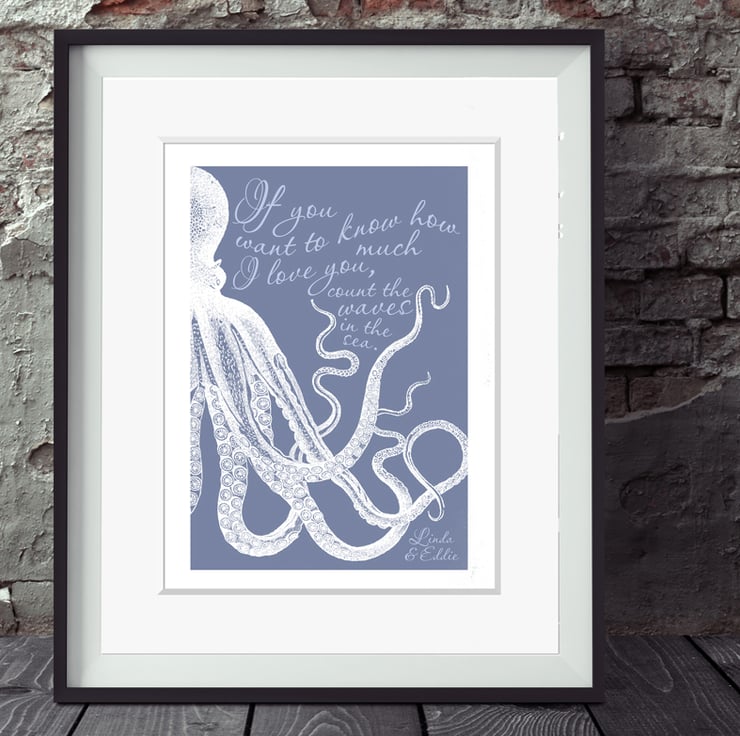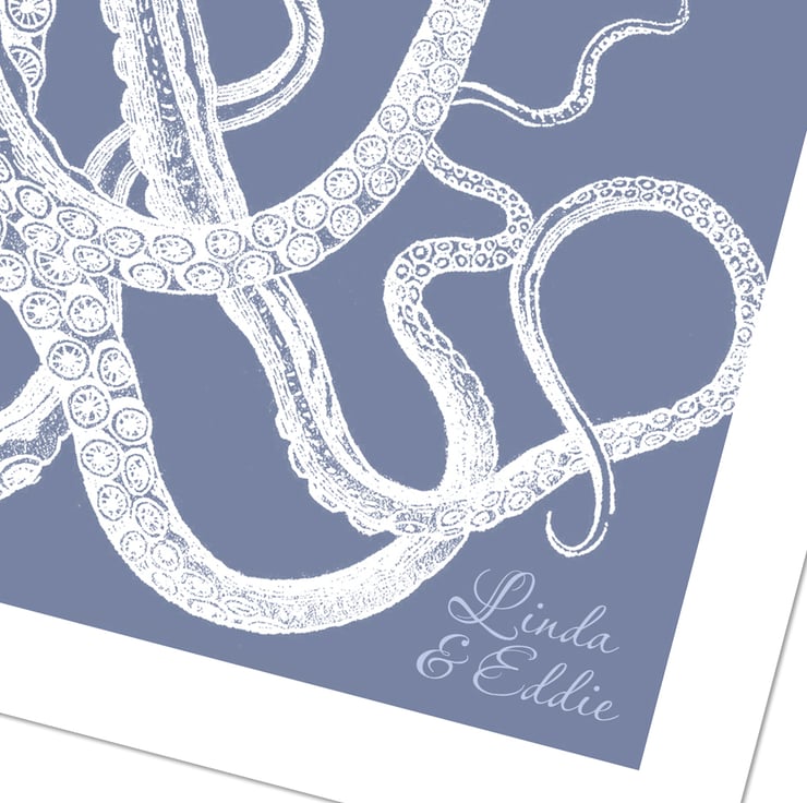 The stunning Waves in the Sea personalised word art print is a fantastic romantic gift for a wedding, anniversary or Valentine’s Day. This lovely nautical print is created especially for you and subtly personalised with your chosen names. The print features a fabulous vintage octopus illustration and features crisp dusky blue and white colours.