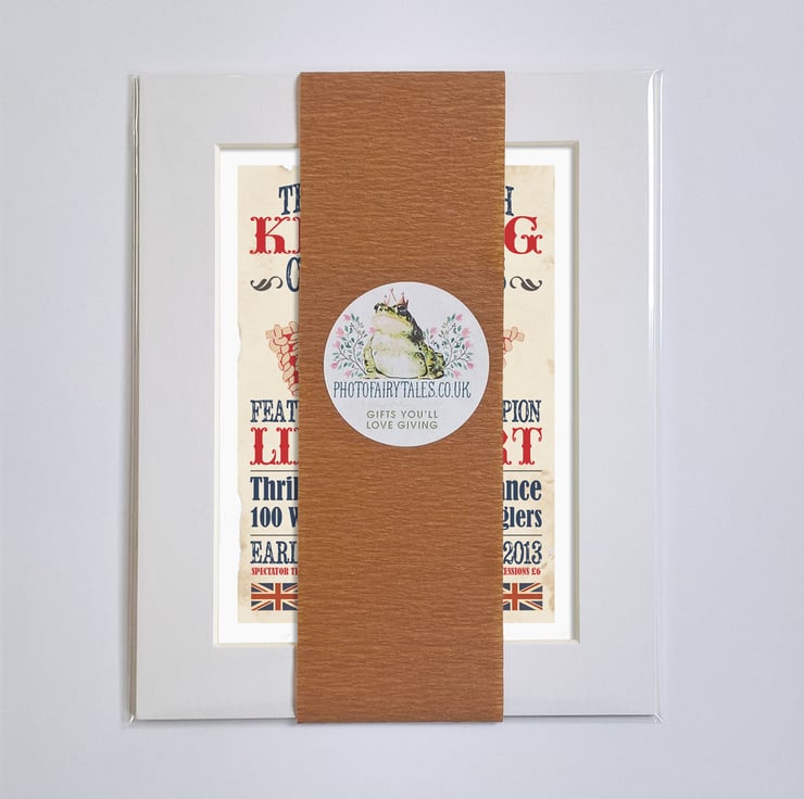 Your artwork is created to order and printed on high quality gloss finish paper stock. It is presented with a backing board and white bevel cut mount, and sealed in a smart clear presentation sleeve. Posted in a strong hard backed envelope. The print and mount is 10inches x 8inches (approx 25.4cm x 20.3cm) and will fit any standard 10x8 picture frame.