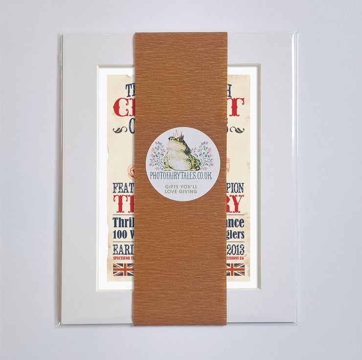 Your artwork is created to order and printed on high quality gloss finish paper stock. It is presented with a backing board and white bevel cut mount, and sealed in a smart clear presentation sleeve. Posted in a strong hard backed envelope. The print and mount is 10inches x 8inches (approx 25.4cm x 20.3cm) and will fit any standard 10x8 picture frame.