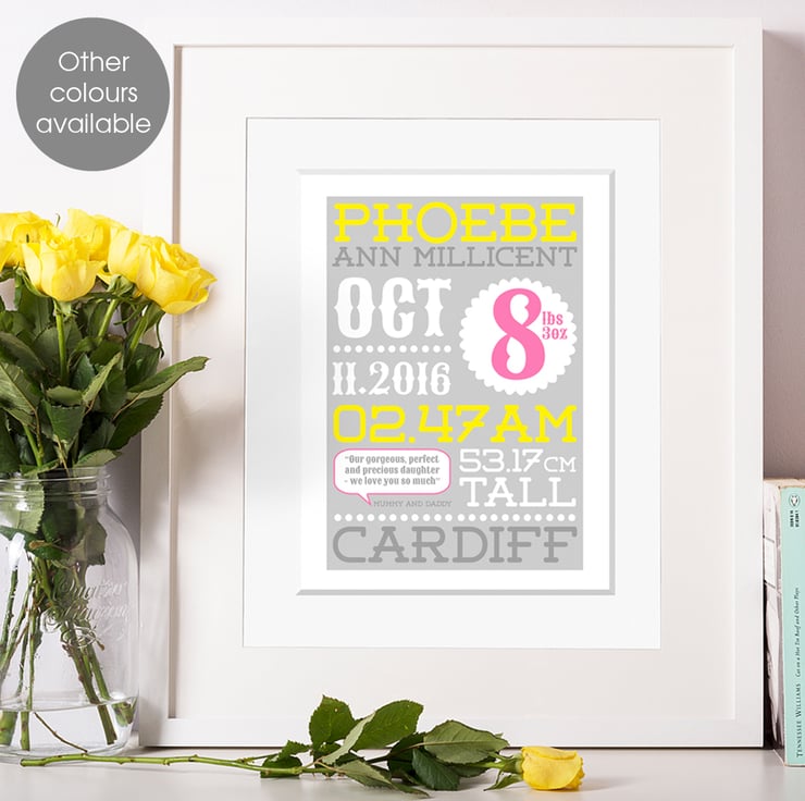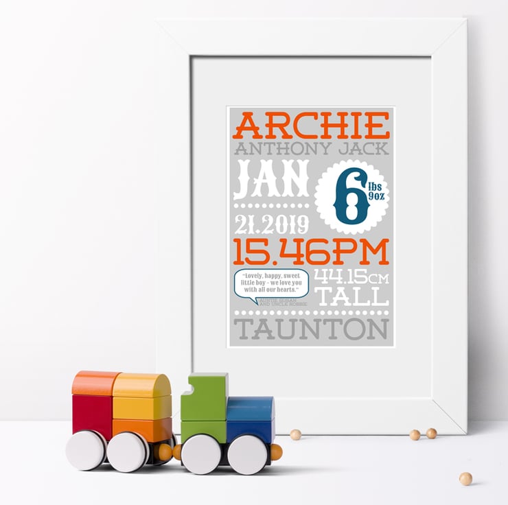 Each print features baby's name, date of birth, place of birth & more. There’s space on the print for your own personal message (max 14 words). The sender's name(s) are also included - eg, 'Mummy and Daddy' or 'Granny and Grandad' (max 5 words). Tip: if you can't fit in everyone's individual names, you can adjust the wording to something like 'The Smith Family', etc.