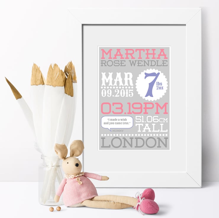 The arrival of a newborn is a momentous event, so mark the moment with one of these contemporary personalised birth stat prints. A great personalised gift for a christening or new parents.