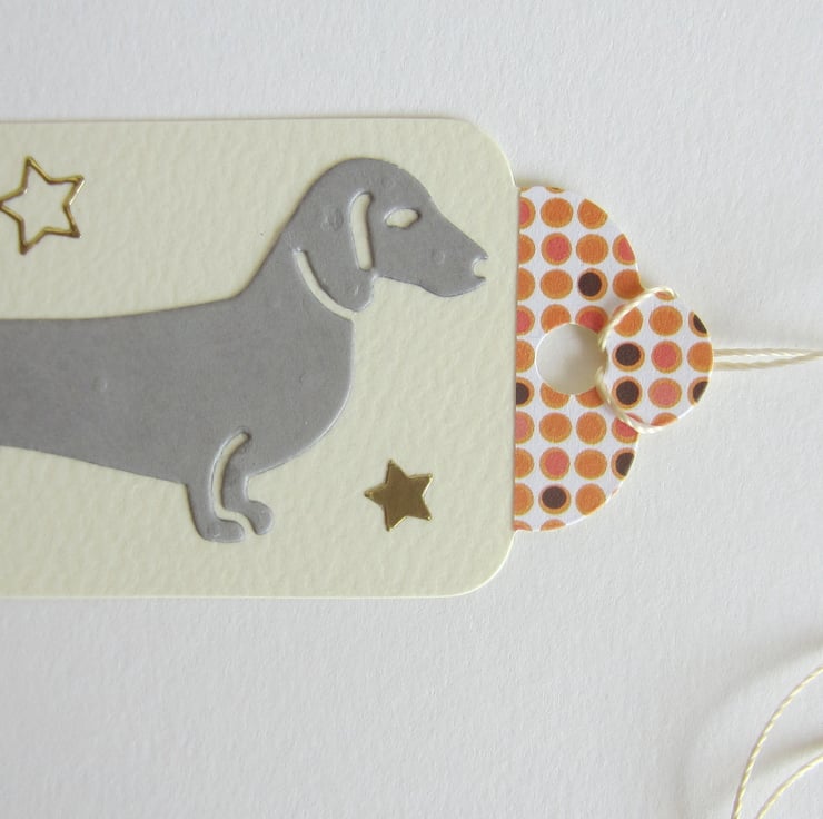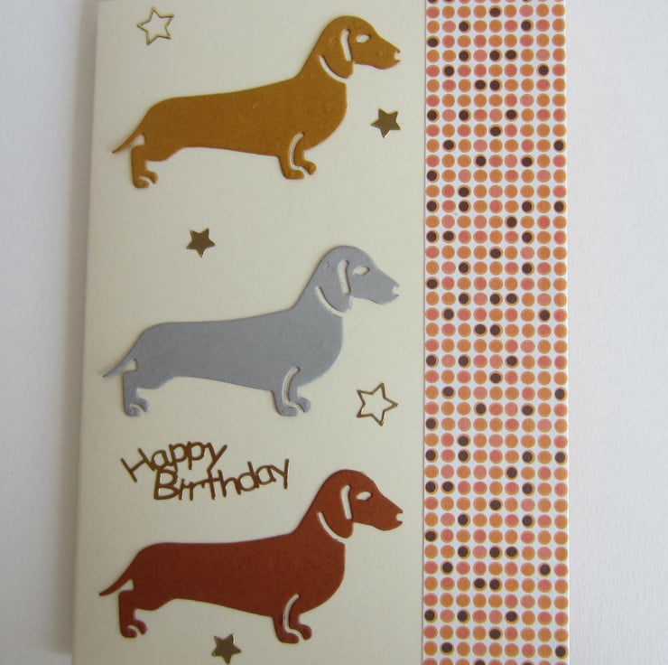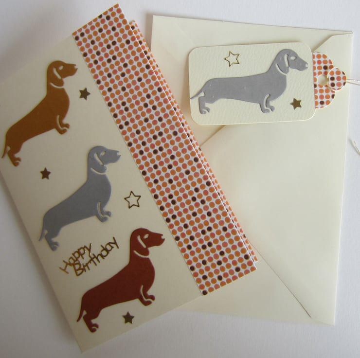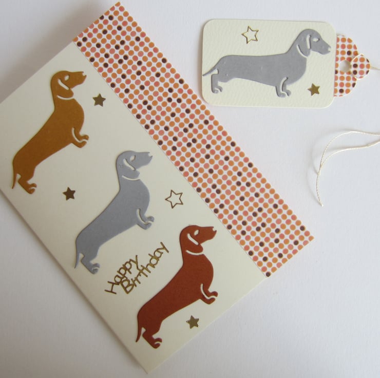 Handmade Happy Birthday card and matching gift tag with a design of die cut dachshunds and a patterned paper on a cream background.