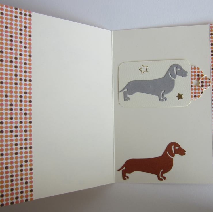 Card measures 148 x 105 mm (5 3/4 x 4 inches approx.) and has a matching sausage dog design inside.