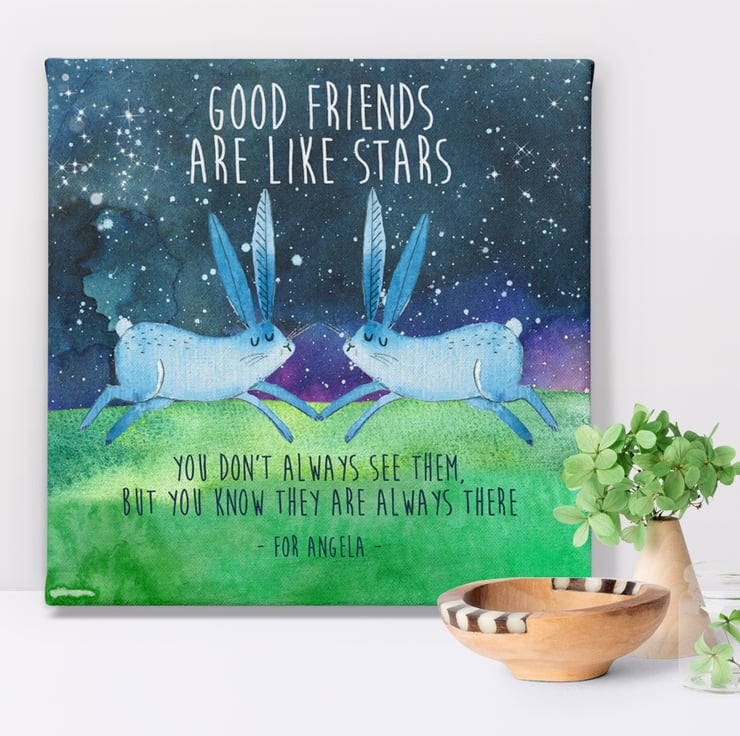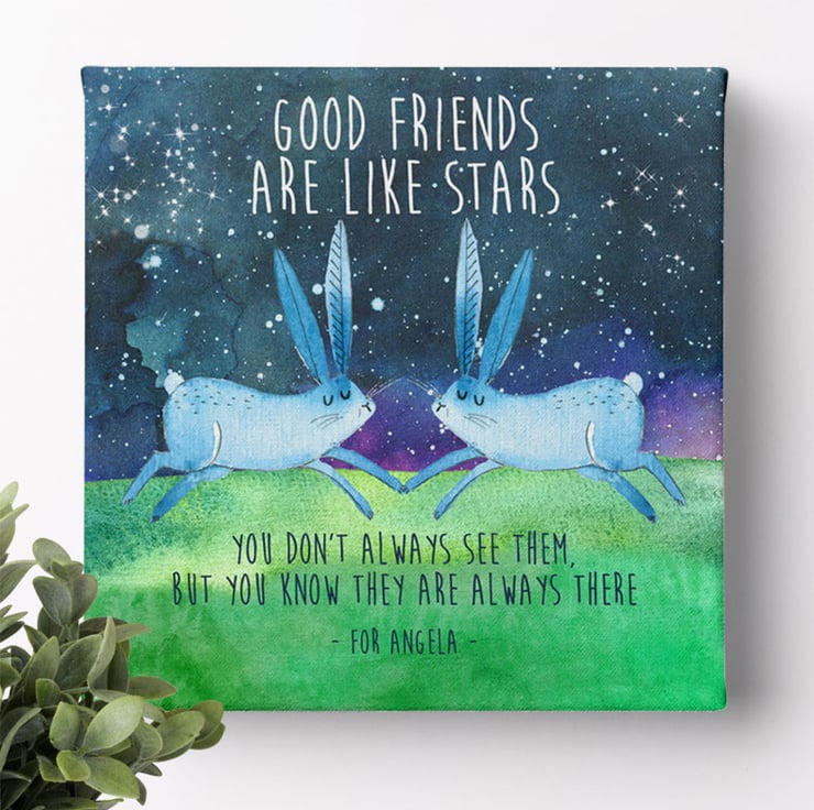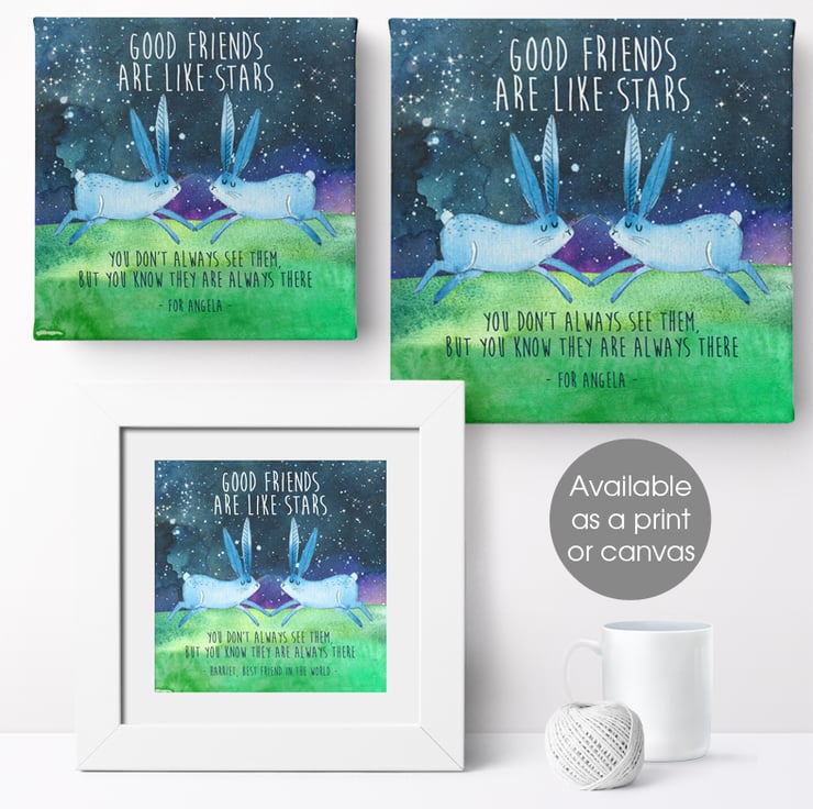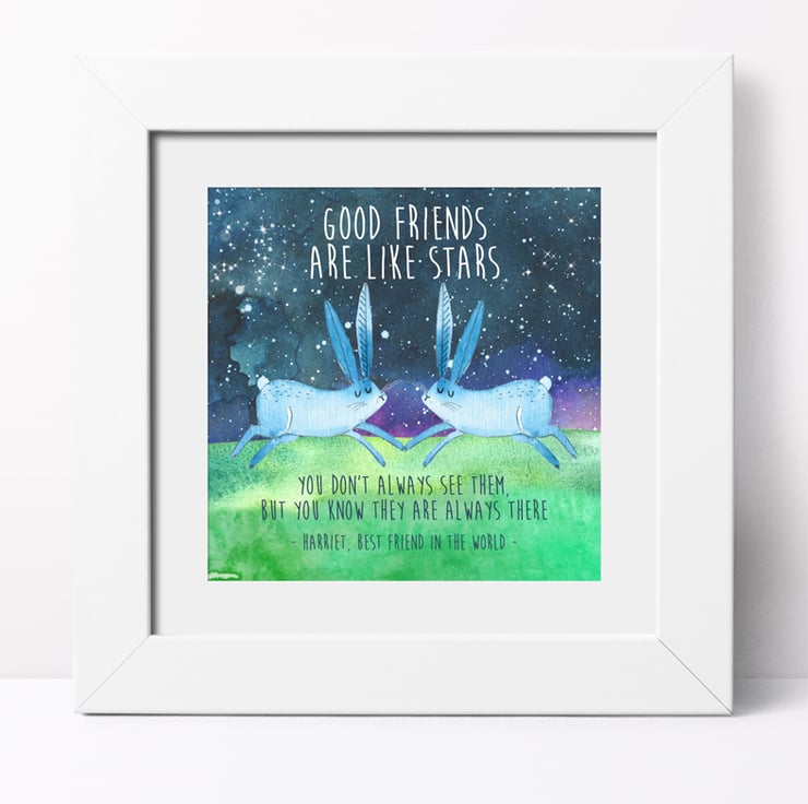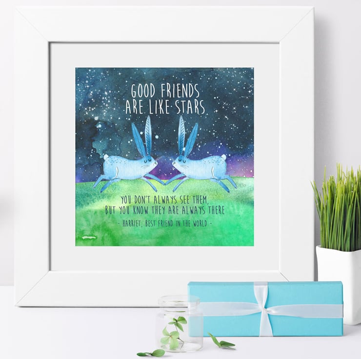This delightful personalised print is the perfect gift for your best friend that they’ll treasure - a lasting keepsake as a 'thank you' or house move gift. Celebrate your friendship even if you can't be together as often as you'd like. Good friends are important, so let them know how much you value their support & the bond you have with each other. Personalised with your own short message, the print features the wording 'Good friends are like stars - you don't always see them, but you know they are always there', and delightful watercolour graphics.