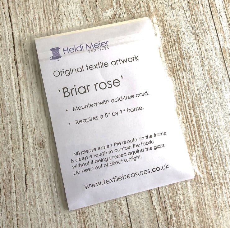 The dog rose has been laced at the reverse and attached securely to a mount, ready to be framed in a 7 by 5 inch frame, which is easily available from a number of stores in a variety of budgets and styles. When selecting your frame, do ensure the rebate of the picture frame is deep enough to accommodate the thickness of the textile artwork.