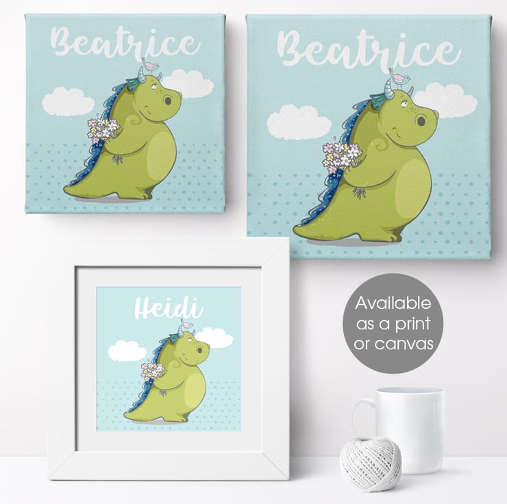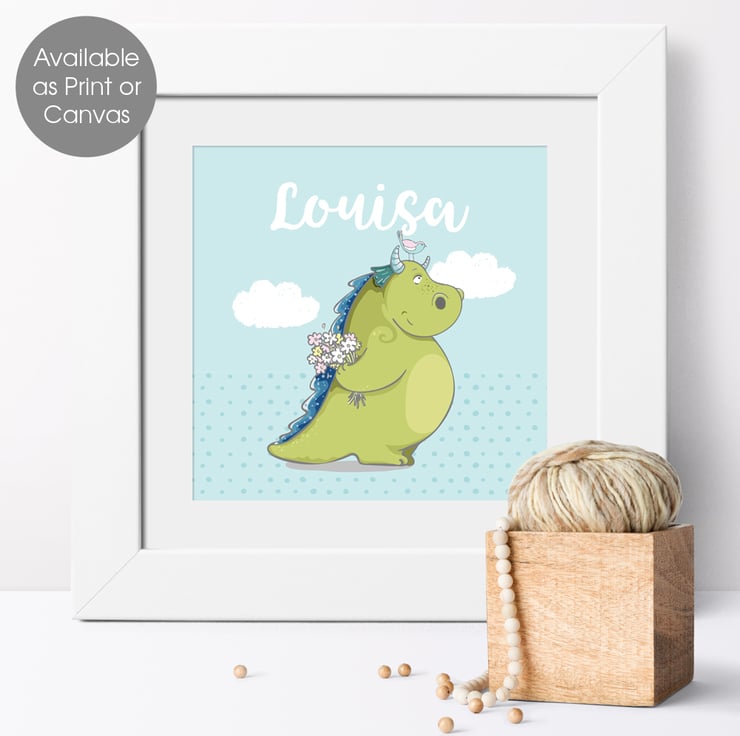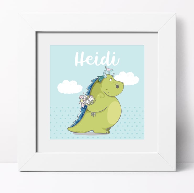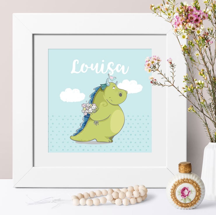 This personalised print features a cute, friendly little dragon that your little girl will adore! A lovely gift for a special birthday or christening, it's a beautiful finishing touch for her bedroom wall. Personalised with any name in a lovely script-style font, this Dragon print is sweet without being overtly 'princess pink' - ideal if you want to move away from traditional girly pink in a little girl's bedroom but still want something pretty!