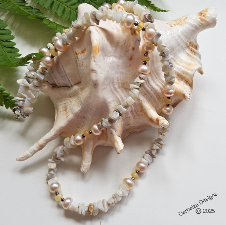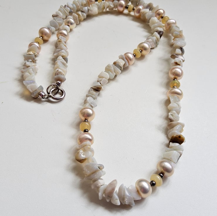 A beautiful dainty pretty necklace designed and hand crafted in Cornwall using quality small genuine wello opal plain roundels, Australian opal nuggetts, complimented with button freshwater culture peals with tiny 2mm 925 sterling silver spacer beads.
