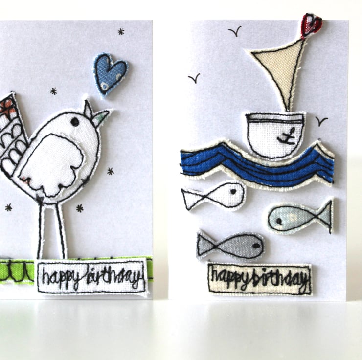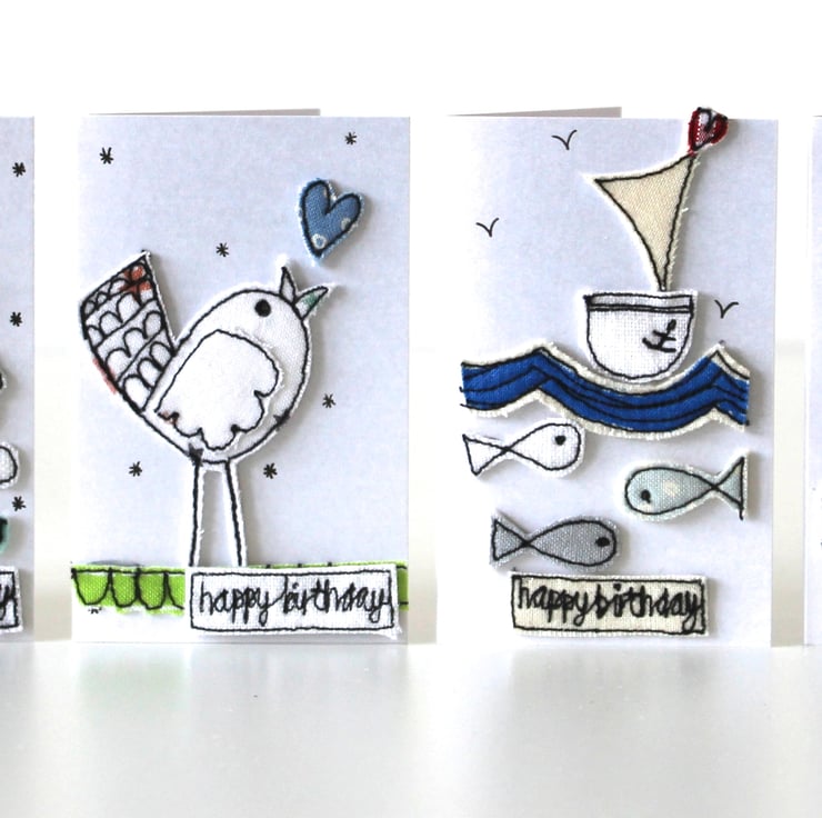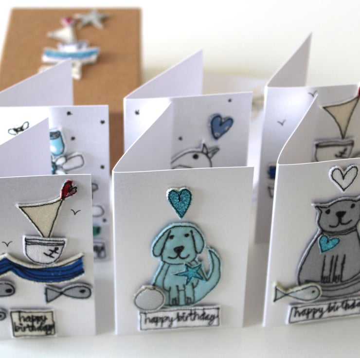 Each card has either a unique sewn, birdie, blooms, sailing boat, cat or dog with a sewn 'happy birthday' label.