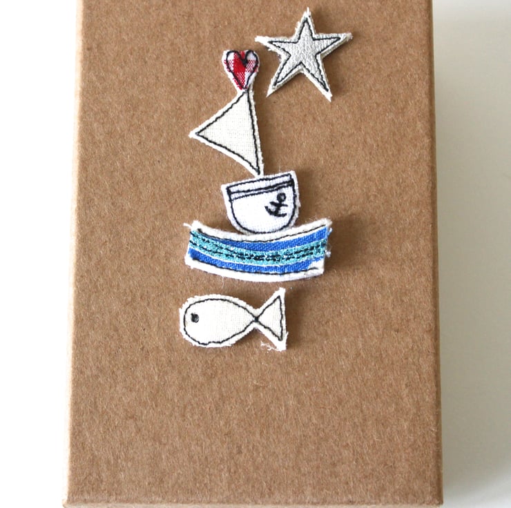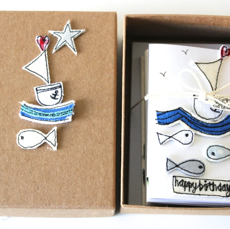 A lidded brown kraft coloured box with a sewn fabric sailing boat, star and fish on the front, contains six little cards measuring 8.5cm x 5.5cm, with matching envelopes.