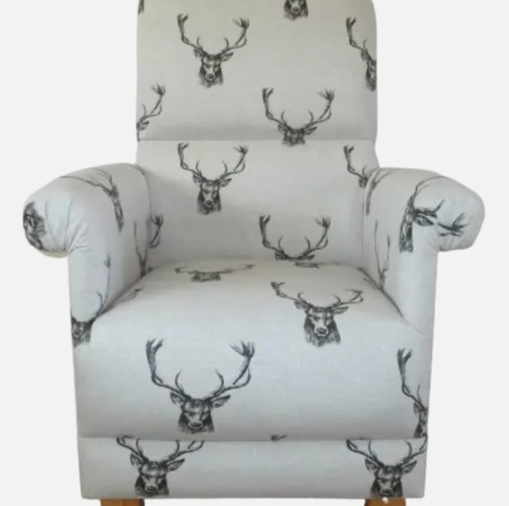 I am offering for sale, this gorgeous adult sized chair, which has been made by me, a professional upholsterer with 32 years experience, using Fryetts Stag Heads fabric in Grey.