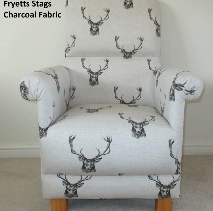 I am offering for sale, this gorgeous adult sized chair, which has been made by me, a professional upholsterer with 32 years experience, using Fryetts Stag Heads fabric in Grey.