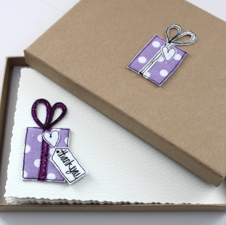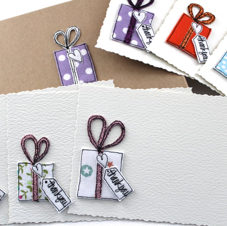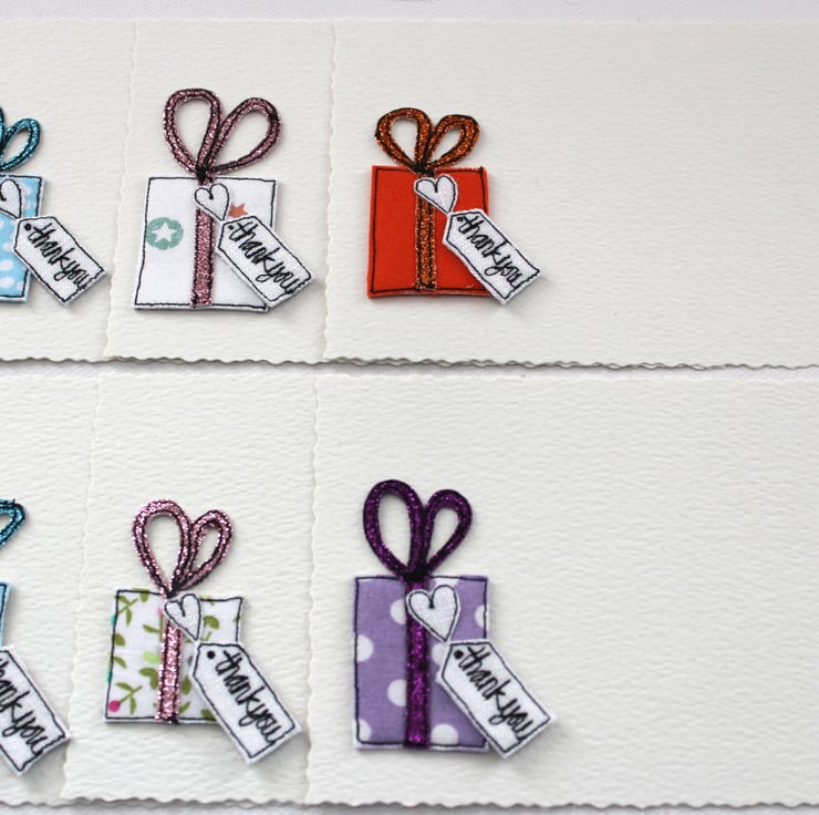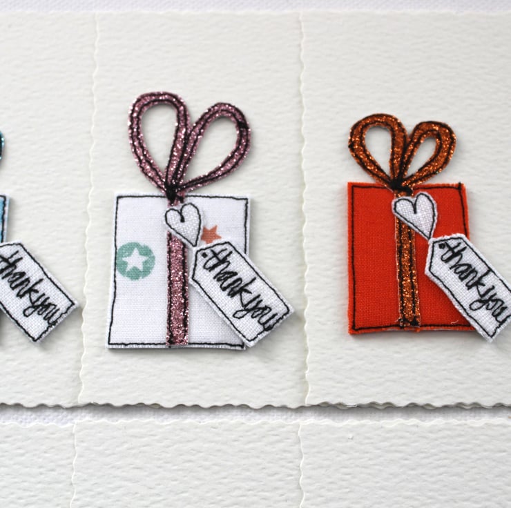 Each postcard has a sewn present, a glitter bow, a linen heart and a sewn label 'thank you'.