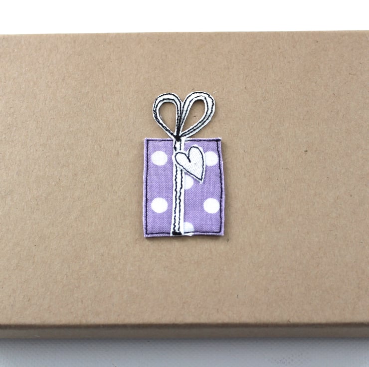 A lidded, brown paper covered box, with a sewn fabric 'present and heart' on the lid,