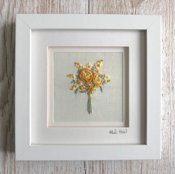 Embroidered bouquet of flowers with roses in a golden yellow combination, hand stitched by textile artist Heidi Meier.