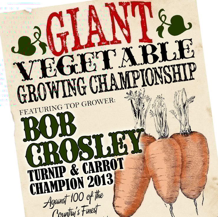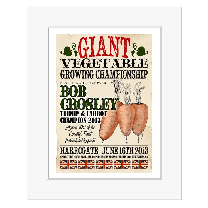 A fun bespoke print with a lovely vintage feel - a great personalised gift for a gardener and keen, or not so keen, vegetable grower! The print has an attractive nostalgic feel of an old style handbill or flyer. The print is personalised with your chosen name, date and venue.