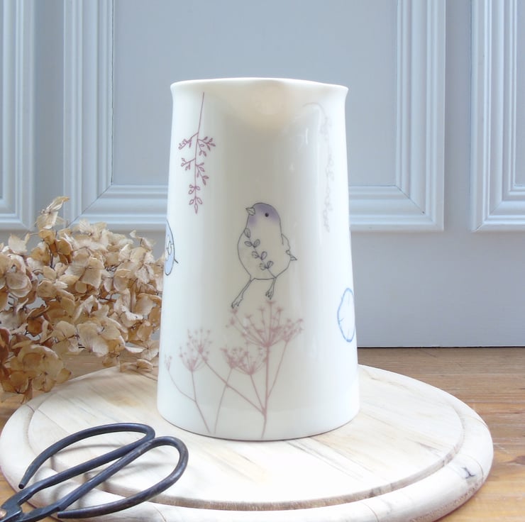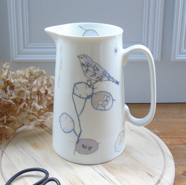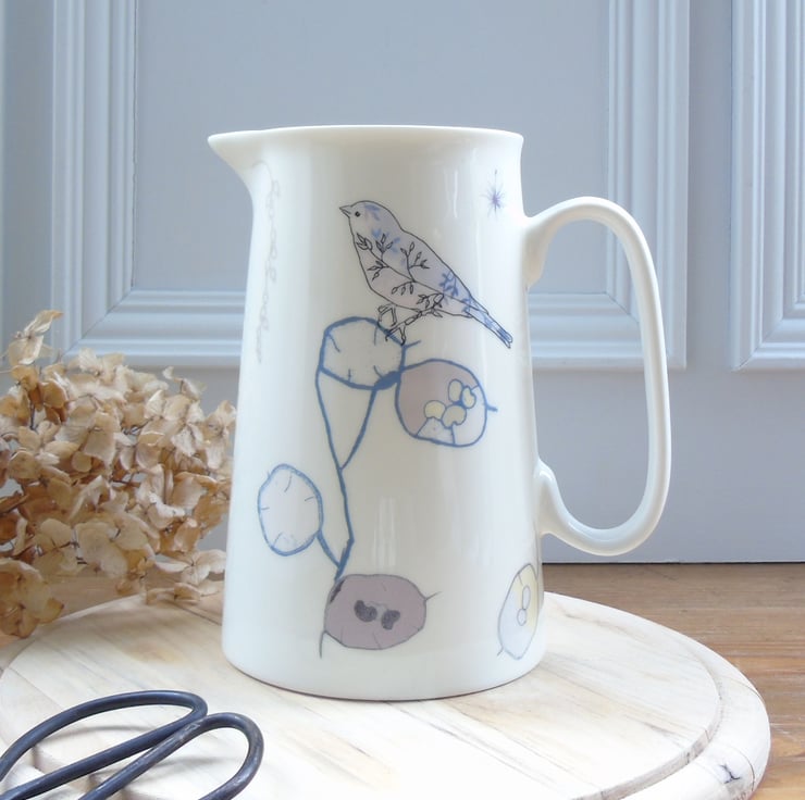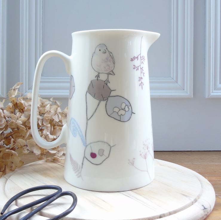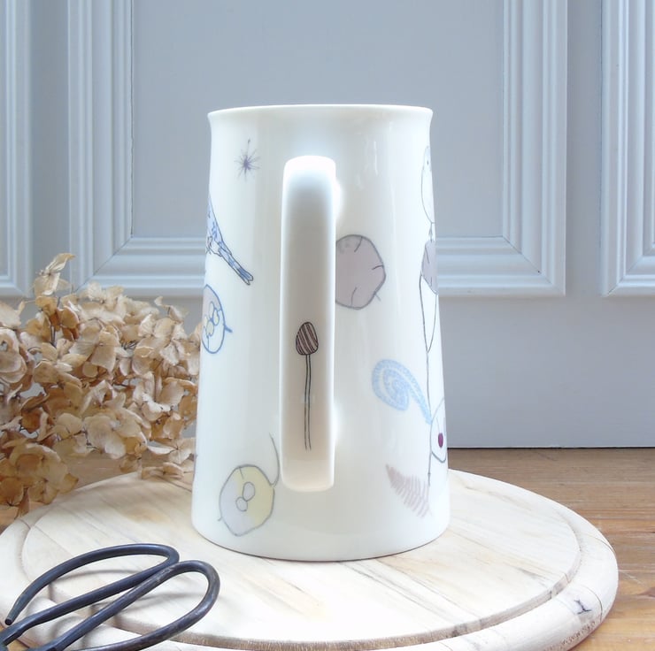 Hand decorated using digital transfers of my watercolour illustrations, each jug has a unique design reaching around the outside with detail on the handle and interior. My illustrations are professionally printed onto ceramic transfers that can withstand being kiln fired to 800°C. Each bird, leaf, seedhead is printed individually for me to compose each design from the separate elements as I decorate the jug making each one special and unique.