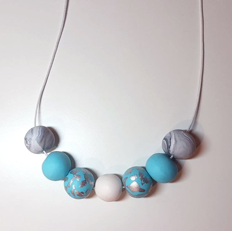 Each bead has been carefully colour mixed, then sized and added within a composition to make a complimentary completed string. The beads are threaded onto elastic, so they are easily slipped on and off over the head without any irritating clasps or catches.