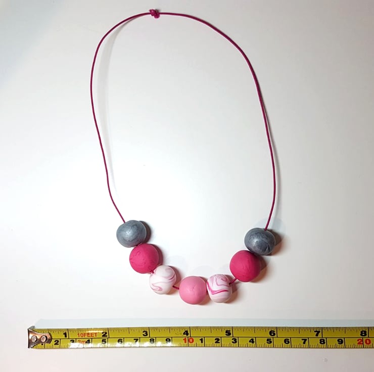 Each bead has been carefully colour mixed, then sized and added within a composition to make a complimentary completed string. The beads are threaded onto elastic, so they are easily slipped on and off over the head without any irritating clasps or catches.
