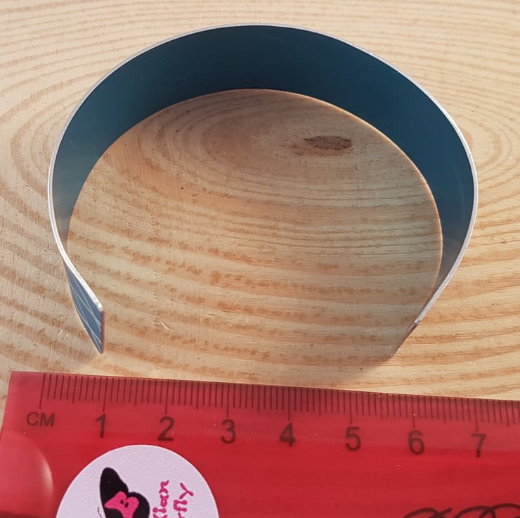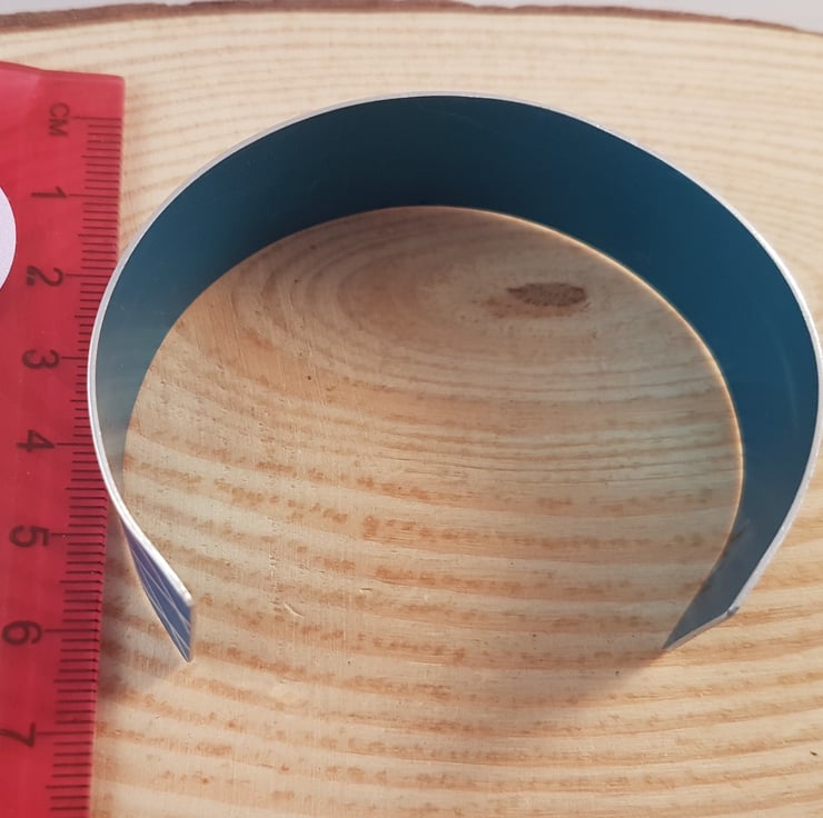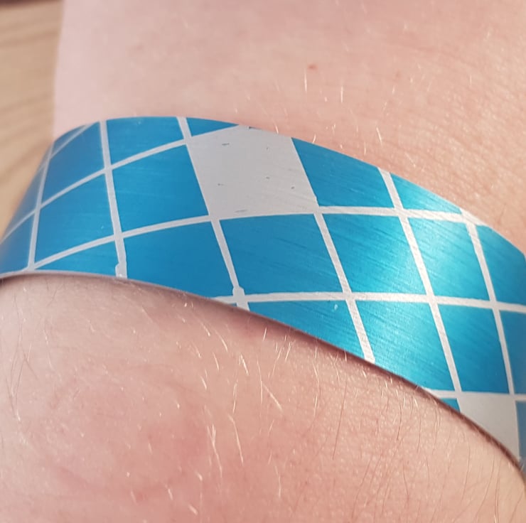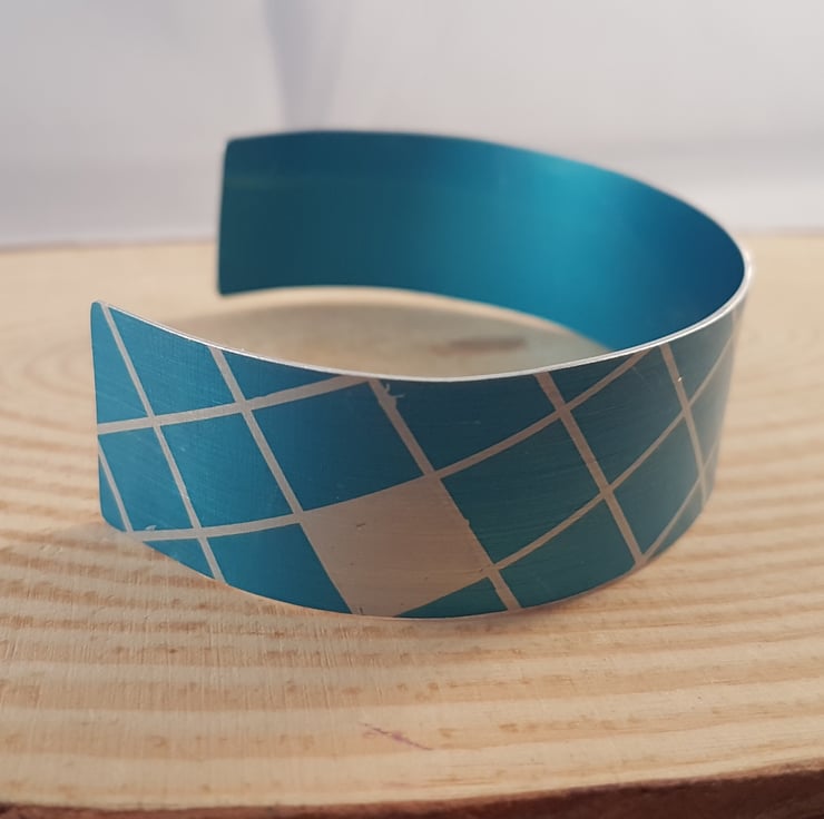 An unusual and decorative bangle, hand made from a sheet of anodised aluminium. A 2cm wide strip of aluminium has been hand cut, and hand drawn with a checkerboard pattern. It has then been dyed a vibrant blue. The aluminium has then been bent around a mandrel to form a bangle.