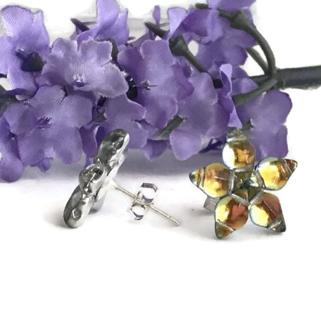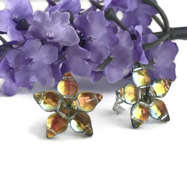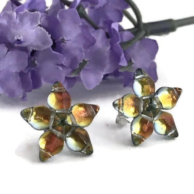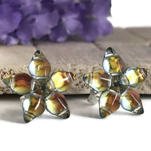 A pretty pair of flower stud earrings that change colour from golden yellow to burnt orange with hints of pink as you move.