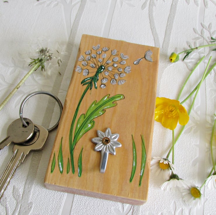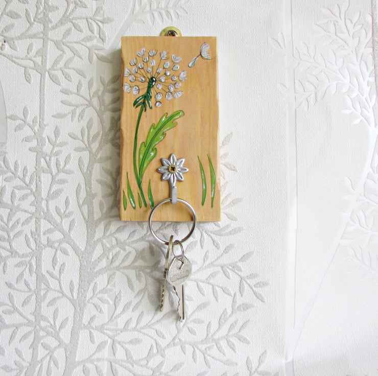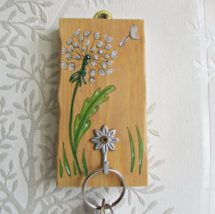 A pretty key hook to keep your keys in a safe place, no need to loose your keys around the house, keep them safe on this handpainted wooden key plaque. Painted in acrylic paints and varnished this simple design of Dandelion Wishes would look great hanging in your home.