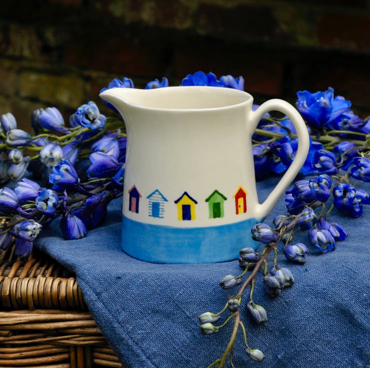 This Beach Hut Milk Jug is hand painted with little beach huts reflecting the unique atmosphere and colour of the English sea-side and the famous Suffolk resort of Southwold.