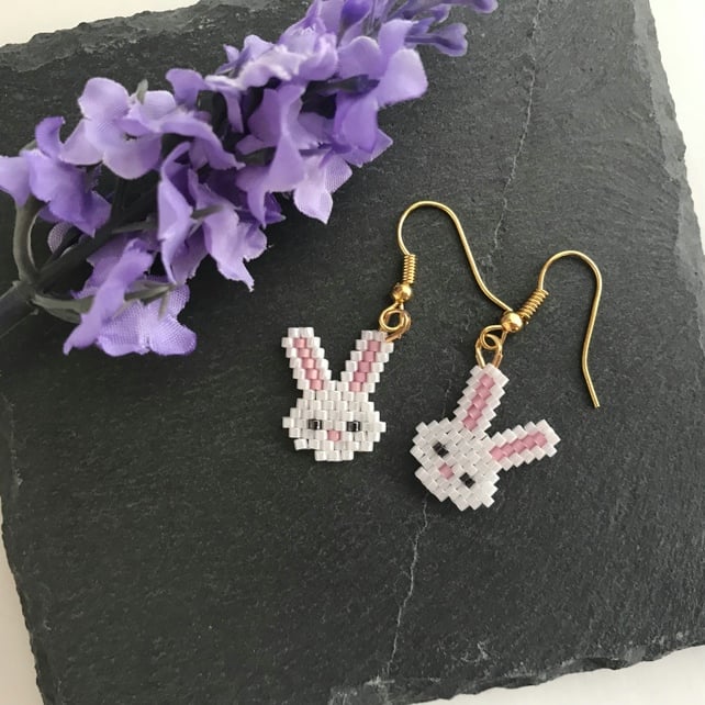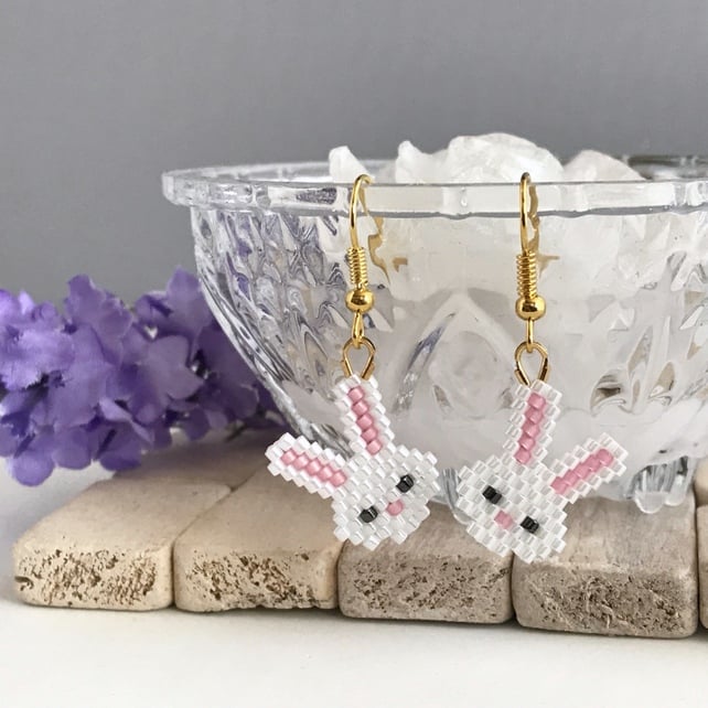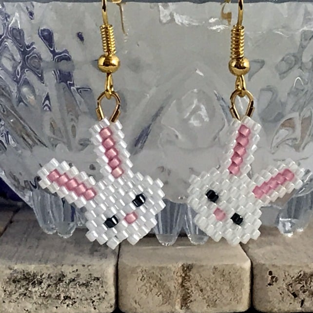 Made by hand sewing small miyuki seed beads together, using the beadweaving technique peyote, to form a bunny head design.