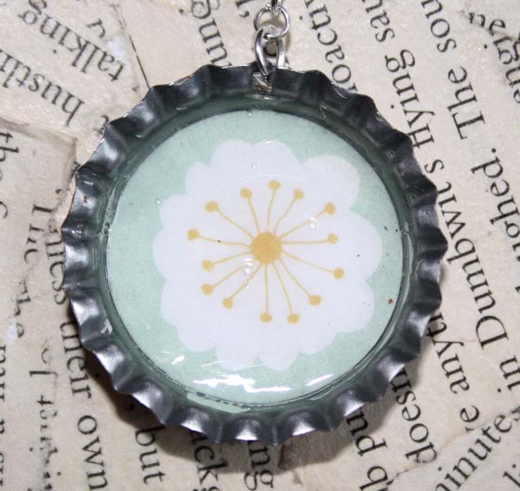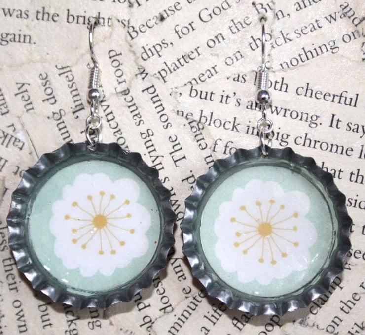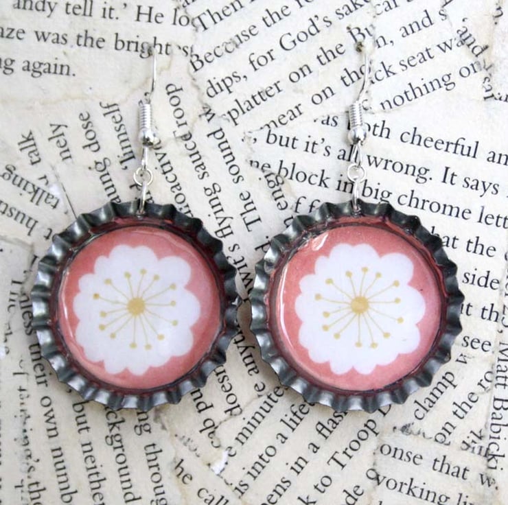 Bottle tops have been given a new purpose as a pair of cute flower earrings. They feature scrapbook paper with stylised flowers. They have then been set with dimensional magic mod podge before being drilled and earring hooks attached.