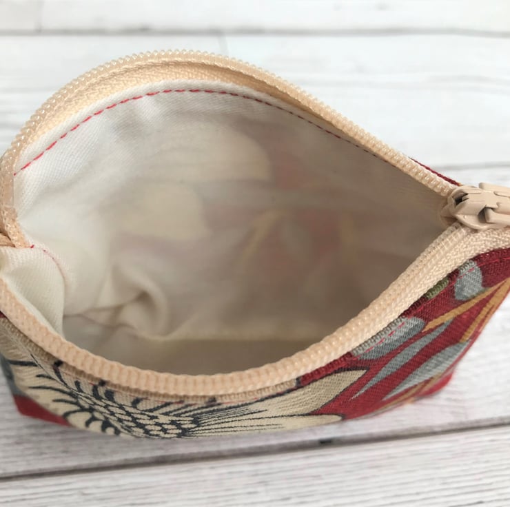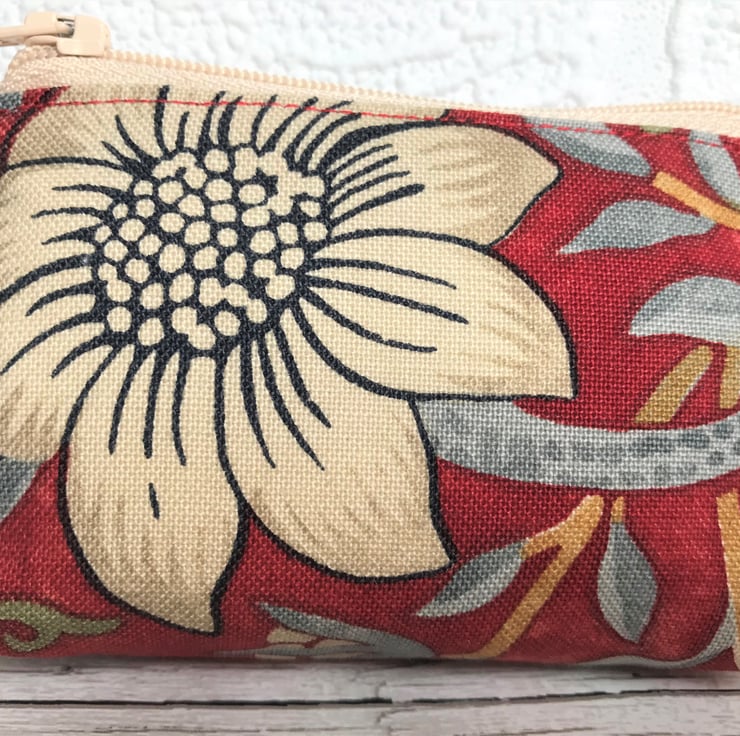 A small coin purse in red fabric featuring the striking Strawberry Thief design by William Morris. The design shows a large cream flower and stems and leaves in pale blue-grey and golden brown on a red background. The coin purse has a matching cream zip and is lined with cream fabric. The base of the purse is boxed to give more space inside.