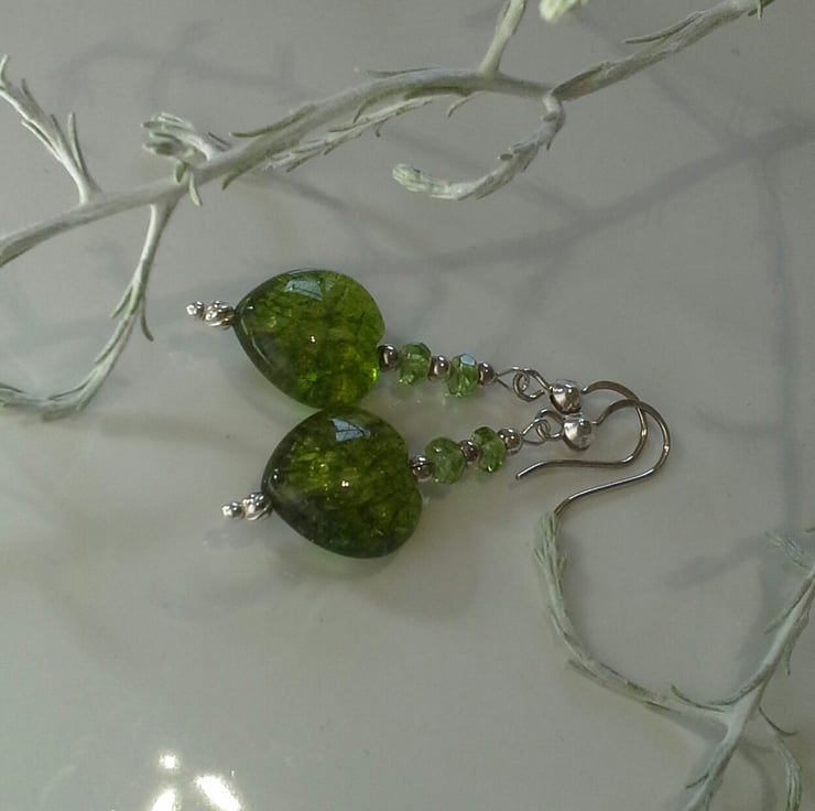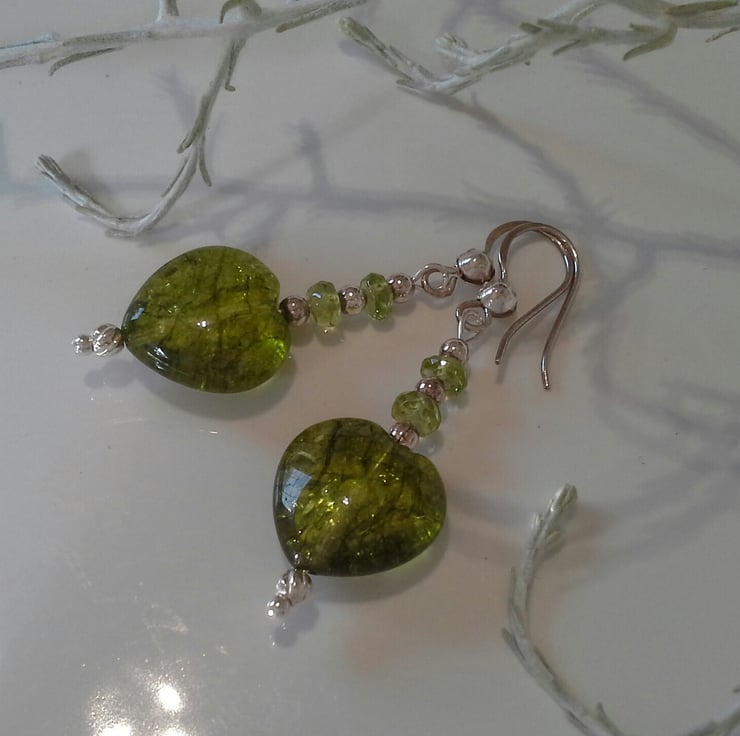 A fabulous unique pair of earrings designed and hand crafted using genuine heart 15 mm by 15 mm cut peridot gemstones, complimented with small faceted roundels. They have been constructed using all 925 sterling silver components.